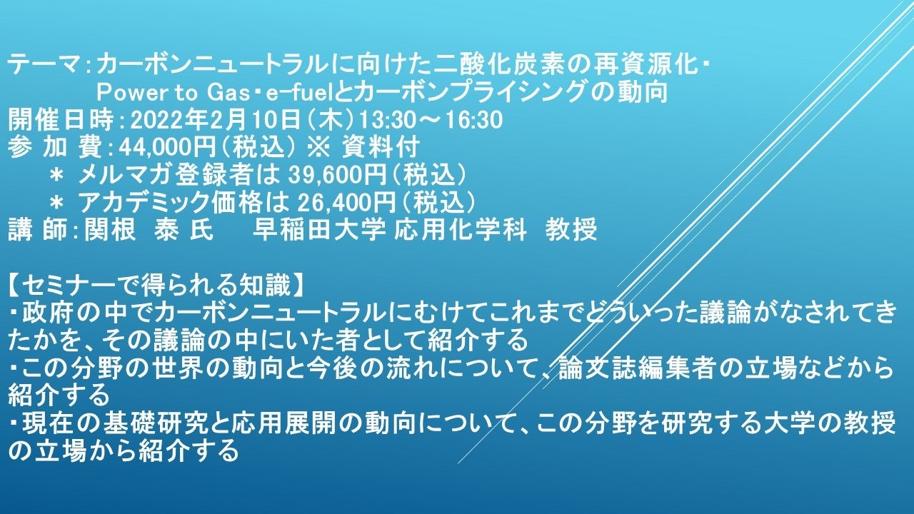 先端技術情報や市場情報を提供している(株)シーエムシー・リサーチ(千代田区神田錦町: https://cmcre.com/ )では、 各種材料・化学品などの市場動向・技術動向のセミナーや書籍発行を行っておりますが、 このたび「カーボンニュートラルに向けた二酸化炭素の再資源化・Power to Gas・e-fuelとカーボンプライシングの動向」と題するセミナーを、 講師に関根 泰 氏 早稲田大学 応用化学科 教授)をお迎えし、2022年2月10日(木)13:30より、 ZOOMを利用したライブ配信で開催いたします。 受講料は、 一般:44,000円(税込)、 弊社メルマガ会員:39,600円(税込)、 アカデミック価格は26,400円(税込)となっております(資料付)。