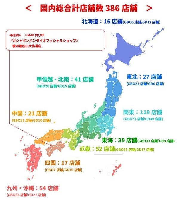 株式会社バンダイナムコアミューズメントは、株式会社バンダイのカプセルトイブランド「ガシャポン」の専門店『ガシャポンバンダイオフィシャルショップ』駿河屋松山大街道店を、2025年3月19日(水)、大型ホビーショップ「駿河屋松山大街道店」(愛媛県松山市)内にオープンします。