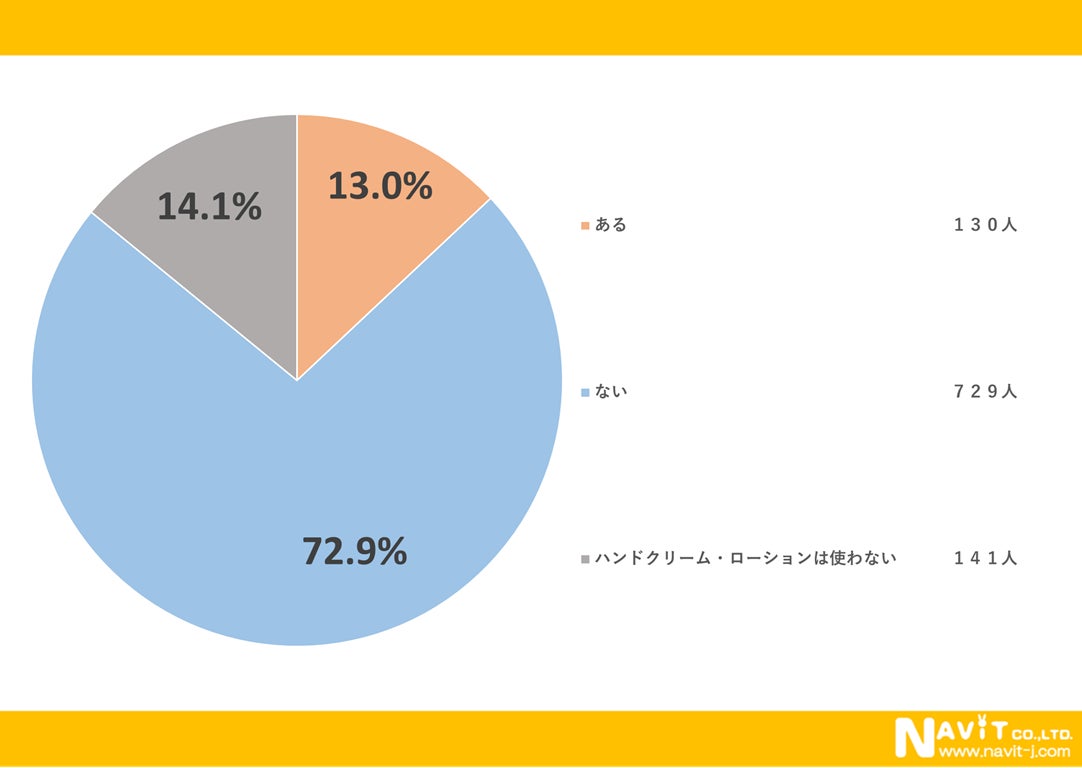 過去にハンドクリームやローションを使って肌トラブルが起きましたか?というアンケートに対して「ない」と回答された人が72.9%という結果になりました。反対に「ある」と回答された人が13.0%なので、ハンドクリーム類は比較的トラブルが起きにくい商品のようです。