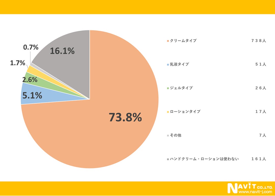 どんなタイプのハンドクリーム・ローションを使っているかたずねたアンケートでは「クリームタイプ」が圧倒的に人気で73.8%という結果になりました。次にずいぶん離れて「乳液タイプ」が5.1%と続いています。