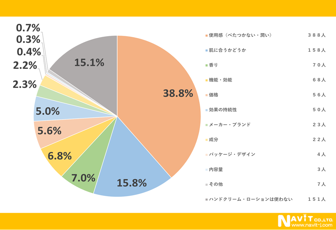 ハンドクリームやローションを選ぶ基準についてたずねたところ「使用感(べたつかない・潤い)」で38.8%でした。次に多かったのが「肌に合うかどうか」で15.8%、「香り」が7.0%と続いています。
