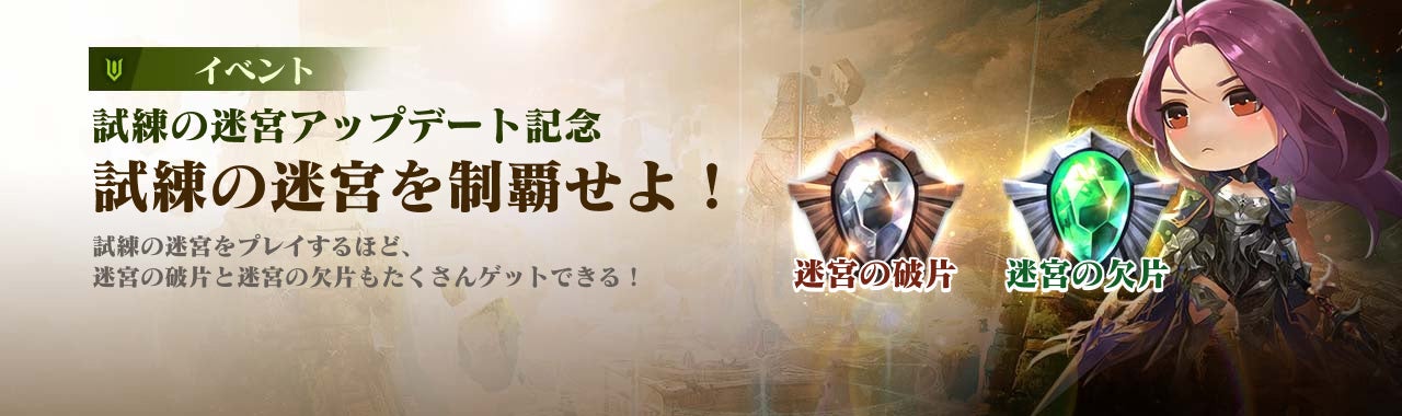 イベント期間中に新コンテンツ「試練の迷宮」に関連する様々なミッションをクリアすることで、「迷宮の破片」や「迷宮の欠片」などのアイテムを獲得できます。