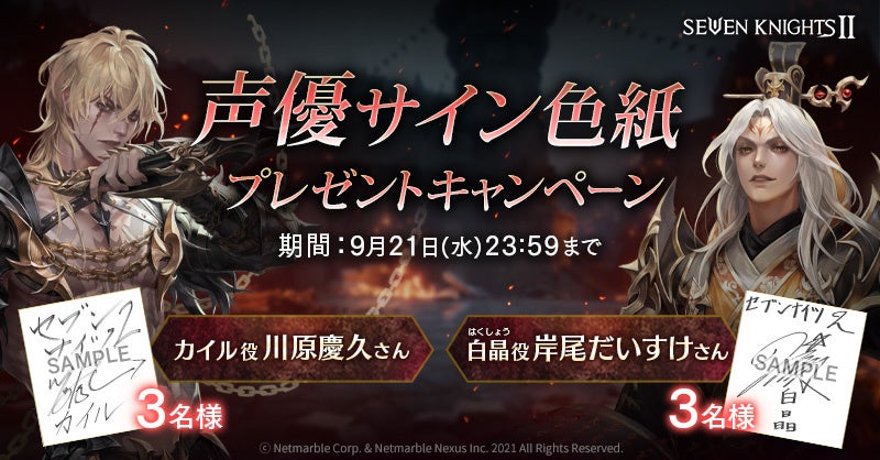 キャンペーン期間中に、『セブンナイツ2』公式Twitter(https://twitter.com/Sena2_JP)をフォローのうえ、キャンペーンツイートをリツイートしていただいた方の中から抽選で、川原慶久さんと岸尾だいすけさんの直筆サイン色紙を各3名様にプレゼントいたします。