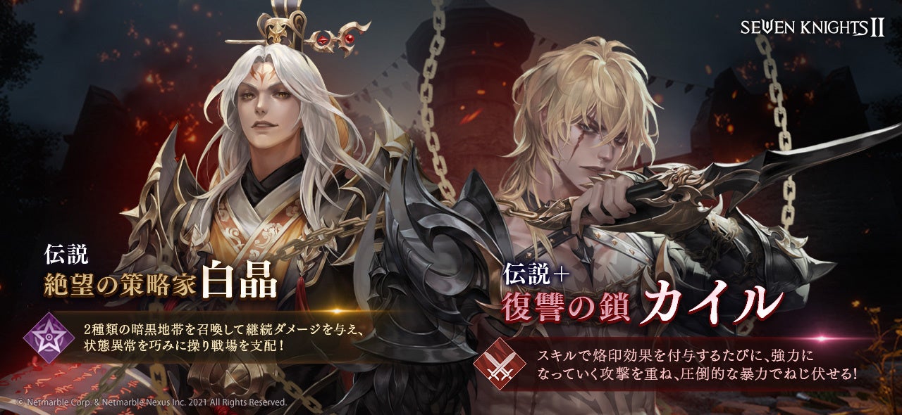 『セブンナイツ2』の世界に新たな英雄として伝説+「復讐の鎖 カイル(CV.川原慶久)」と伝説「絶望の策略家 白晶(CV.岸尾だいすけ)」が参戦いたします。