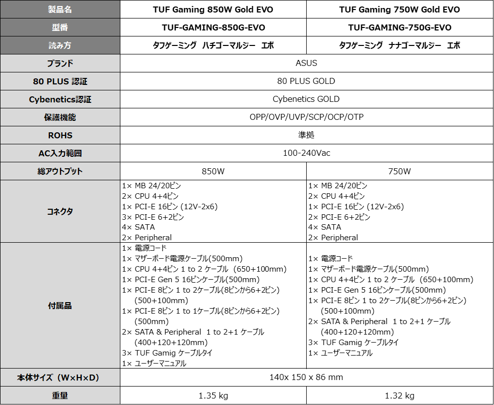 「TUF-GAMING-850G-EVO」「TUF-GAMING-750G-EVO」