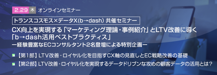 【トランスコスモス×データX(b→dash)共催セミナー】CX向上を実現する「マーケティング理論・事例紹介」とLTV改善に導く「b→dash活用ベストプラクティス」を2/29(木)に開催