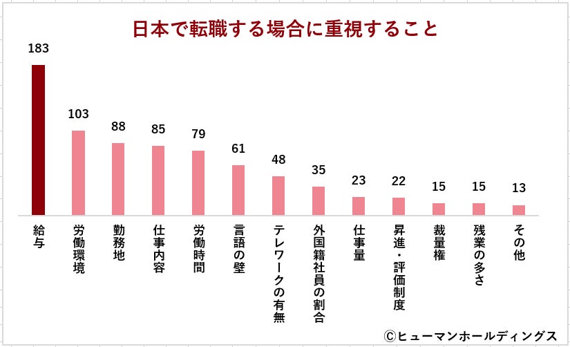 「日本で転職する場合に重視すること」については、「給与」が最も多く、「労働環境」「勤務地」「仕事内容」と続く結果となりました。