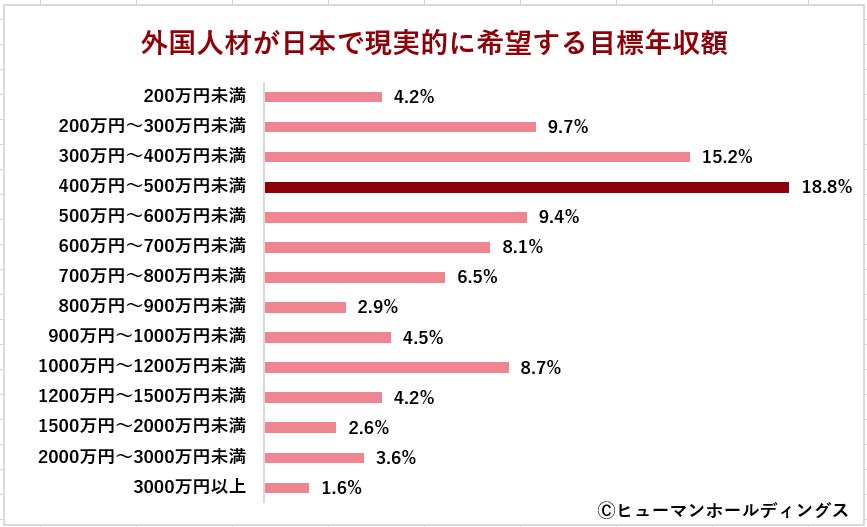 「日本で現実的に希望する目標年収額」についての質問には、「400万円~500円未満(18.8%)」が一番多い結果となり、「300万円~400万円未満」が続きました。これは、今年4月に当社がZ世代を対象として実施した調査と同様の傾向が見られ、昨年、国税庁が発表した「令和4年分 民間給与実態統計調査」による「平均年収458万円」前後の金額を目標としている人が多いことがわかります。外国人材も日本での就労を非常に現実的に捉えていると推察されます。