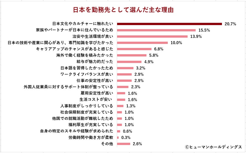 「日本を勤務先として選んだ主な理由」については、「日本文化やカルチャーに触れたい(20.7%)」が最も多く、「家族やパートナーが日本に住んでいるため(15.5%)」「治安や生活環境が良い(13.9%)」が続く結果となりました。勤務先として日本を選択するにあたり、生活する上での希望を重視している様子が伺えます。