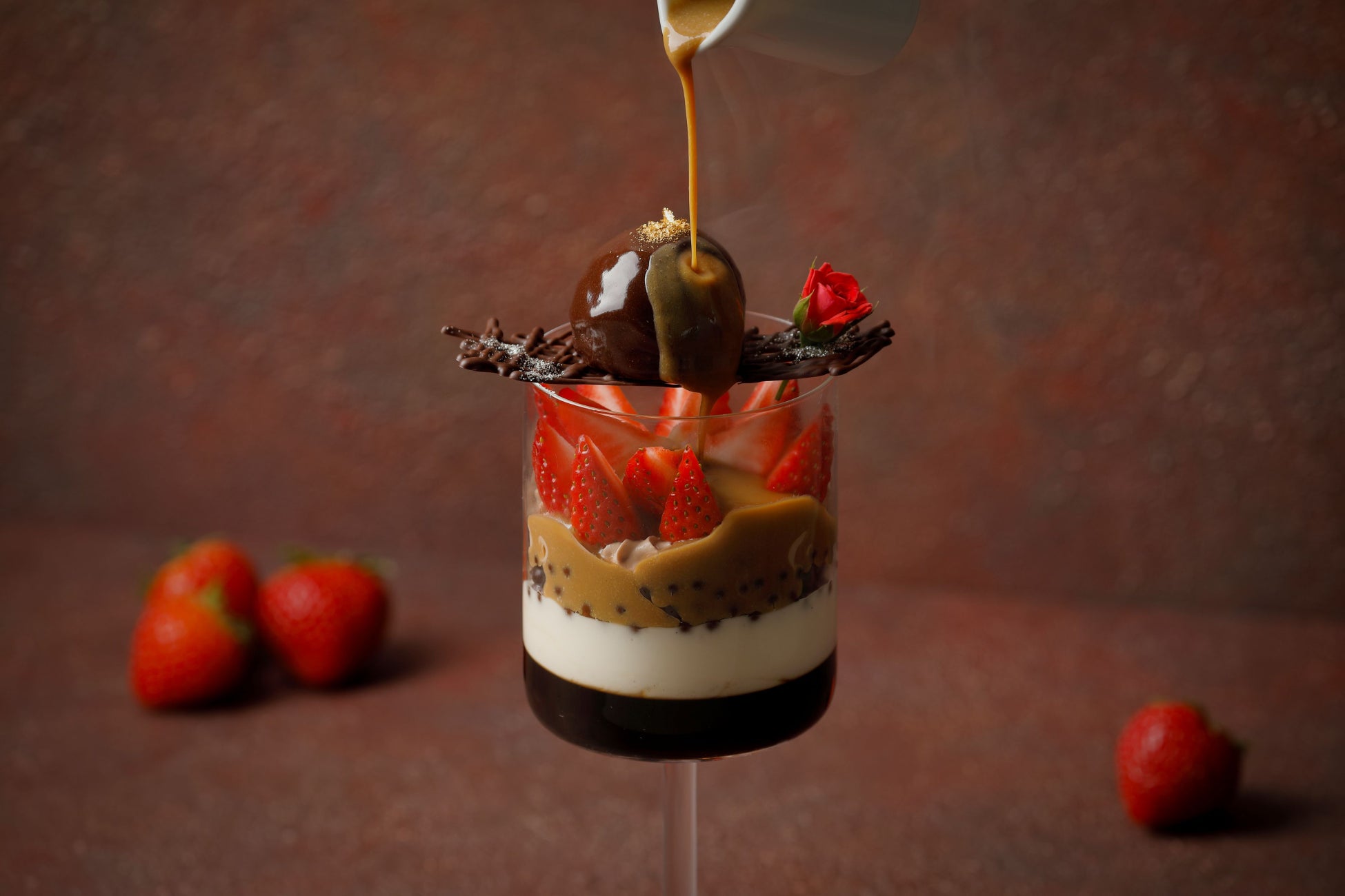 香りの演出には、剪定され廃材となった南高梅の木を使用したスモーク。燻製チップとして焚き上げた香ばしい香りがパフェ全体を包み、ビターで大人な味わいのパフェに仕上がります。グラスの中には紀州備長炭でローストしたコーヒーゼリーのほろ苦さや、まろやかなマスカルポーネ、パールクラッカーの軽やかな食感など様々なアクセントが口の中でやさしく広がります。さらに、上から温かいカフェエッセンスソースをかけることでパフェ全体に深みとコクが足され、五感で感じられる大人のスイーツとしてご堪能いただけます。