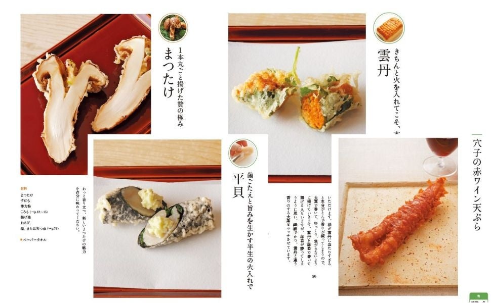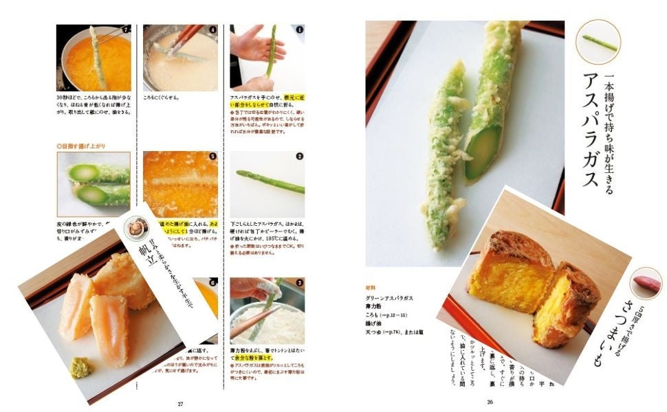 作り方を、動画のように写真で細かくプロセスを追ってご紹介。ひと目で作り方も状態も分かるから、「どうすればよいの?」と迷わずに作れます!丁寧で分かりやすい誌面なので、水分が口いっぱいに広がるみずみずしいアスパラガス、半生の火入れでお刺し身よりも旨みが濃厚な帆立、薄ごろもで油っぽくないかき揚げ、「てんぷら近藤」名物のさつまいも……、どれも、ご家庭で作ることができるんです。
