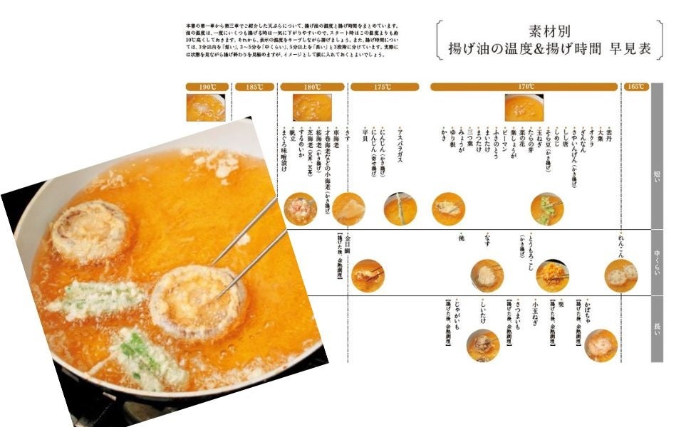 天ぷらを作る時に一番気になるのが、油の量。でもこの本では「フライパンに3cmの油」で揚げるから安心。しかも家庭では、高さ3cmの油で揚げた時に一番おいしい天ぷらが作れるというのは、近藤さんと某大学との研究で証明済み。フライパンは、どこのお家にもある底面がフラットで広めのものがおすすめ。特別な道具は必要ないので、思い立ったらすぐに極上天ぷらが作れます。巻末には、「素材別 揚げ油の温度&揚げ時間 早見表」付き。