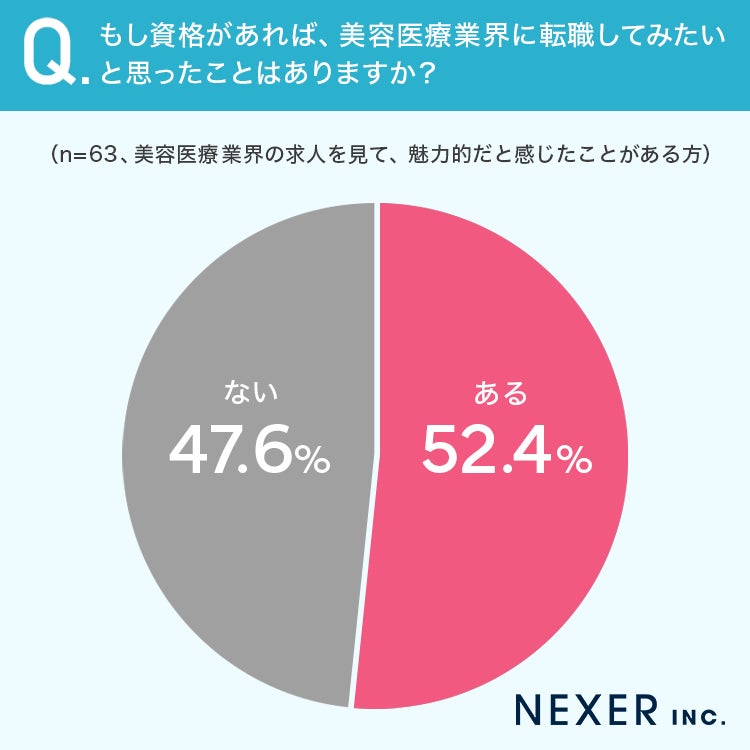 52.4%と半数以上の方が、もし資格があれば美容医療業界に転職してみたいと思ったことが「ある」と回答しています。