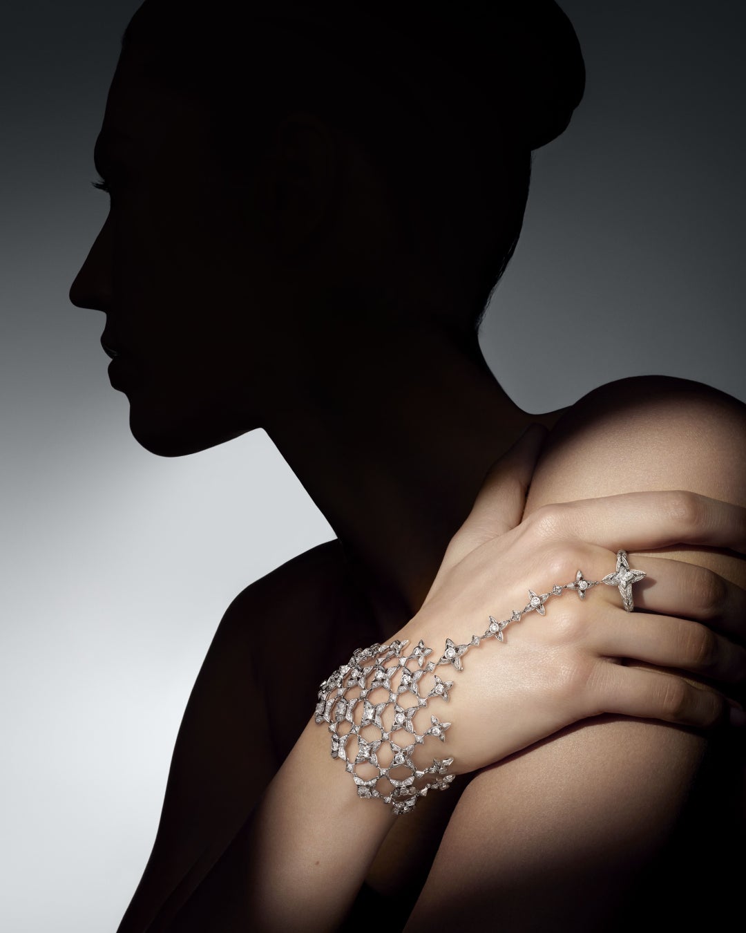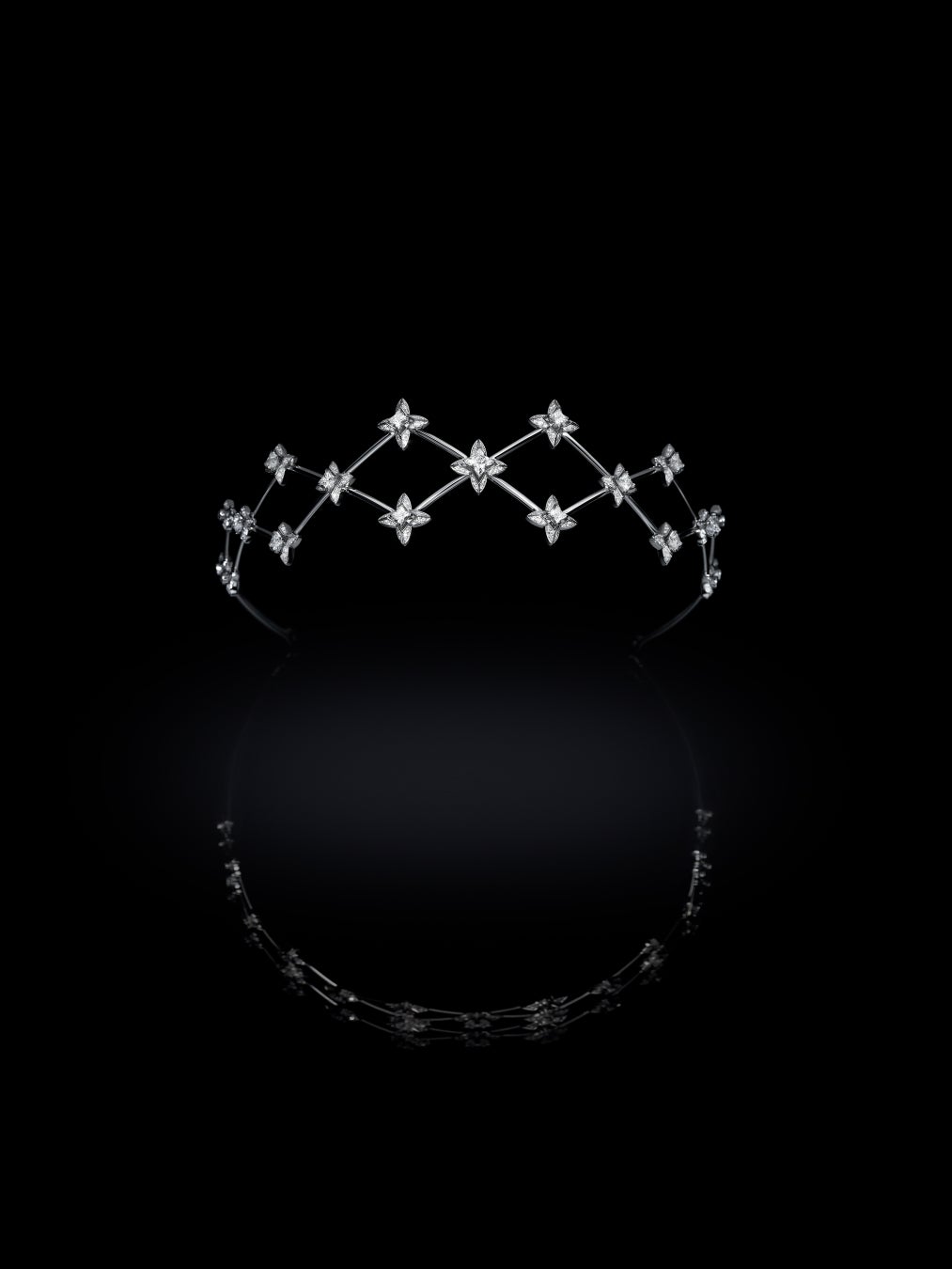 繊細なホワイトゴールドとLV モノグラムスターカットダイヤモンドからなるヘッドバンドは、ルイ·ヴィトンを時代の使者として讃えます。額にまとう幾何学的な格子模様は、「Awakened Hands」の細工と、その後の「Awakened Minds」の熟練の技を想起。伝統と本コレクションならではの発明へのオマージュを融合し遊び心を加えたヘッドバンドは、メゾンのグラフィックコードに精緻でフェミニンな繊細さを添えます。身体の動きに完璧に沿うLV モノグラムスターカットダイヤモンドのモチーフが各デザインに織り込まれ、驚くほど見事な仕上がりに。ダイヤモンドを連ねたチェーンをV字型に配置することで、トランスフォーマブルなブレスレットのグリッド状のオープンウィーブ構造が「Élégance」の象徴となるLV モノグラムスターカットダイヤモンドを集約。同じデザインは、2種のイヤリングにも美しく表現されています。1つは連動させたLV モノグラムスターカットダイヤモンドが滝のように流れるタペストリーを想わせ、もう1つは純粋さをシンプルに際立たせたもの。卓越した繊細な細工により、合計約18カラットのLV モノグラムスターカットダイヤモンドを中心に「Élégance」の遊び心が表現され、トランスフォーマブルなブレスレットやブローチなど、厳選された宝石が本コレクションを比類のない美しさと熟練の技で見事に飾ります。