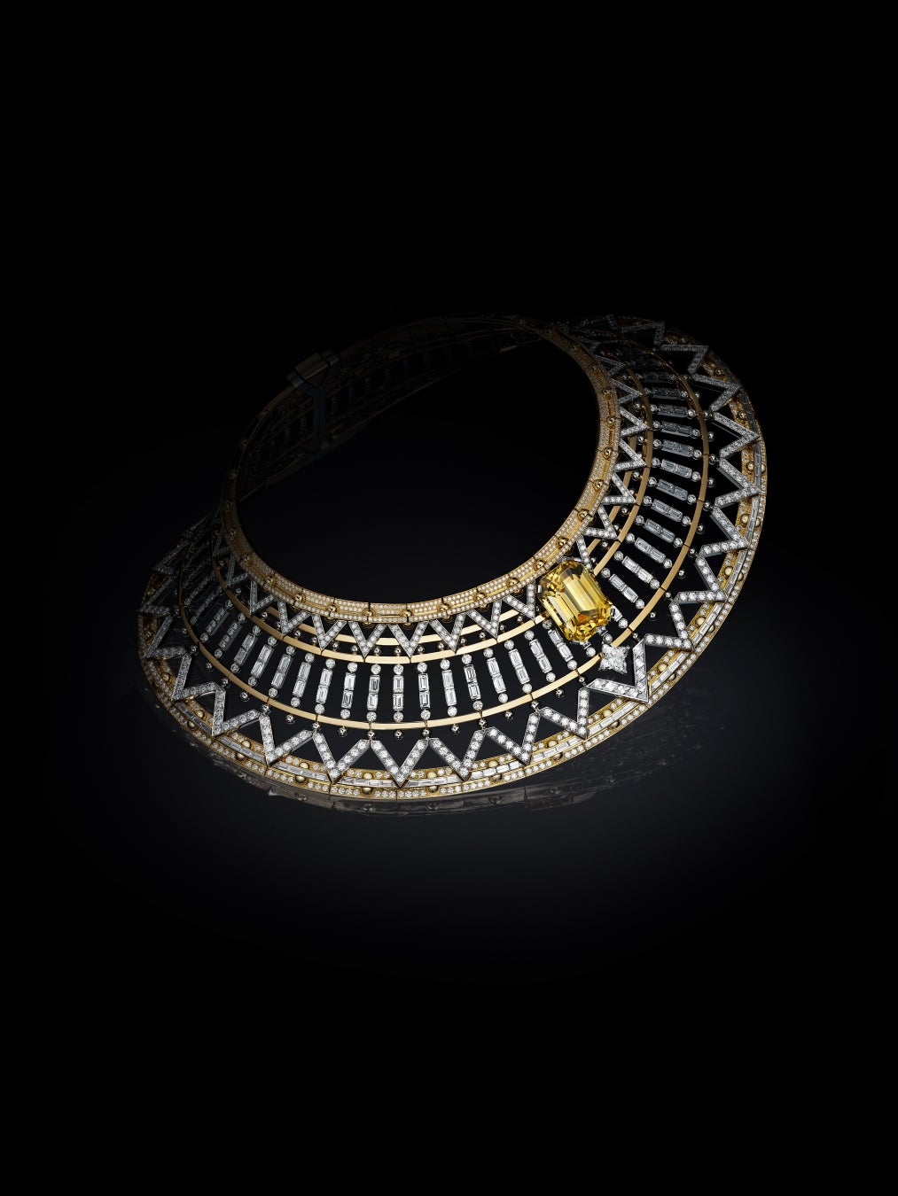 建築的な素晴らしさに感嘆する、この類い稀な創造性の証は、鉄道の驚異を実現させたエネルギーと近代的な金属の偉大な発見との類似点を描き出すために、内側と外側の洗練された仕組みを駆使したもの。織り合わせたように施されたダイヤモンドの中央にセットされた50.01カラットの稀少なオクタゴナルステップカットのスリランカ産イエローサファイアは、太陽のような黄金色の純粋なきらめきを放ち、このネックレスの芸術性を引き立てます。このサファイアの下に優美にあしらわれ、ダイヤモンドをセットしたV字型デザインパターンの中に佇む3.07カラットのLV モノグラムスターカットダイヤモンドは、「Awakened Hands」の殿堂へのオマージュ。ラグジュアリーの真髄と、その壮大な複雑性を強調する「Vision」は、シェブロン·モチーフが織物のようにネックレス、ブレスレット、イヤリング、リングを美しく彩り、啓蒙された国のレガシーを讃えます。