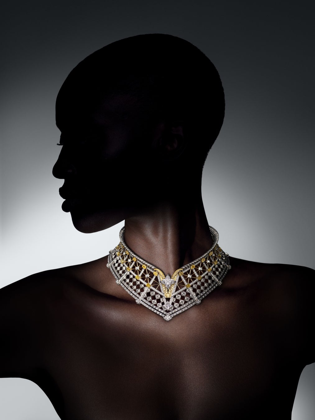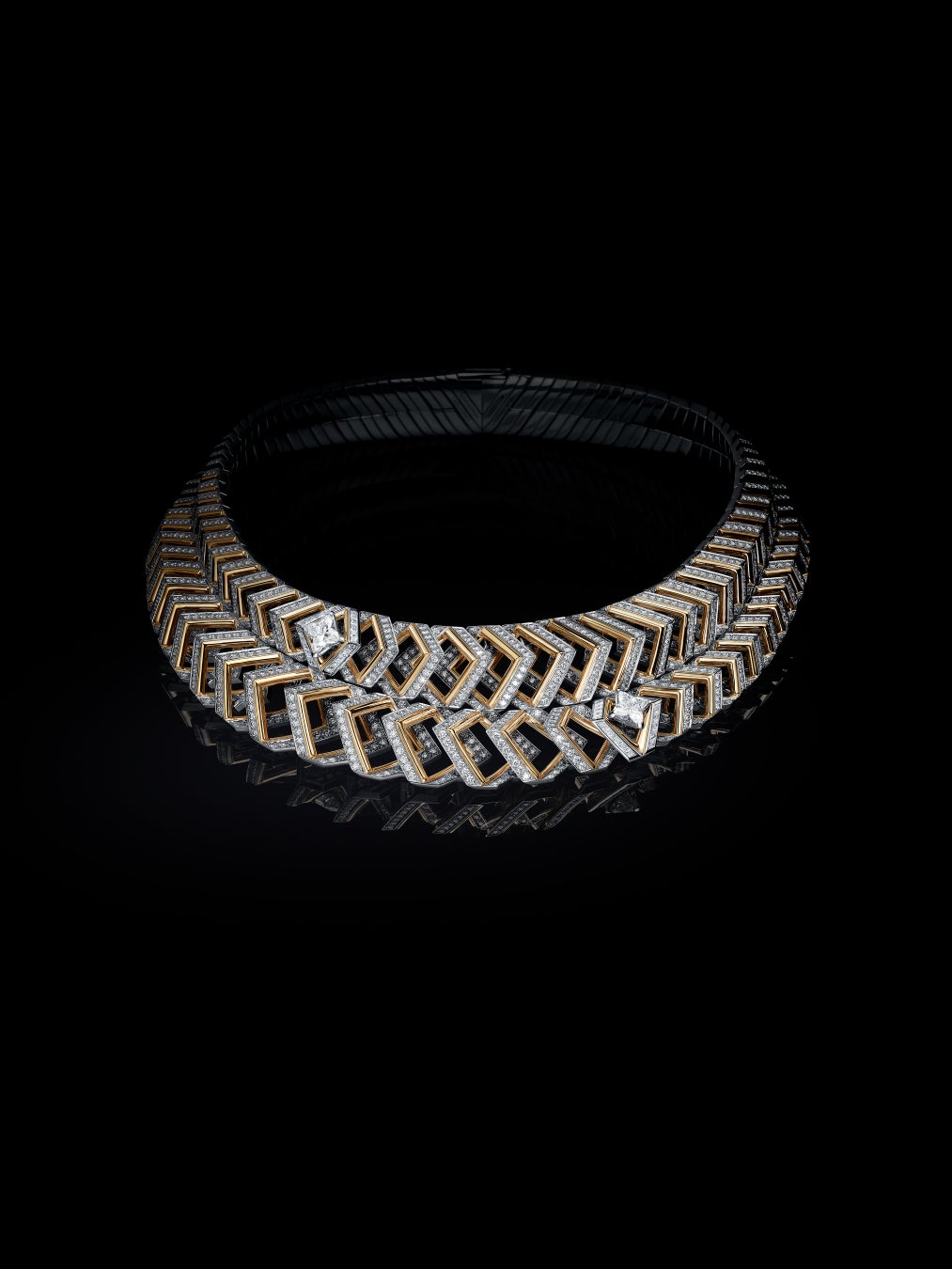 19世紀における産業の成長から着想を得たネックレス「Vision」は、旅の力を生かすことで鉄道の機械化との関係性を探求します。リンクやラグジュアリーに再解釈したビス(鋲)で遊び心を効かせ、各層が連結した多連のネックレスは、プラチナ、イエローゴールド、ダイヤモンドを使用することで産業革命を通して生まれた驚異を反映。ダイヤモンドバゲットとビス(鋲)が交互にセットされたイエローゴールドの三角形モチーフは、その輪が拡大するにつれてデザインの緻密さを増し、メゾンのコードを広大な探求へと駆り立てます。内在する光が脈打つように、矢の形をしたバゲットが、ルイ·ヴィトンのビジョンを集約しながら増大し、エネルギーを放ち続けるコード化されたグリッドを作り上げます。同時に、こうした19世紀の発明により、メゾンを象徴する誠実さも見て取れます。長方形のダイヤモンドバゲットは、ネックレスの下層にプレシャスな輝きで最大限のパワーをもたらし、製作に2,504時間を要したデザインに込められた幾何学的な意味が、その機能を想起。