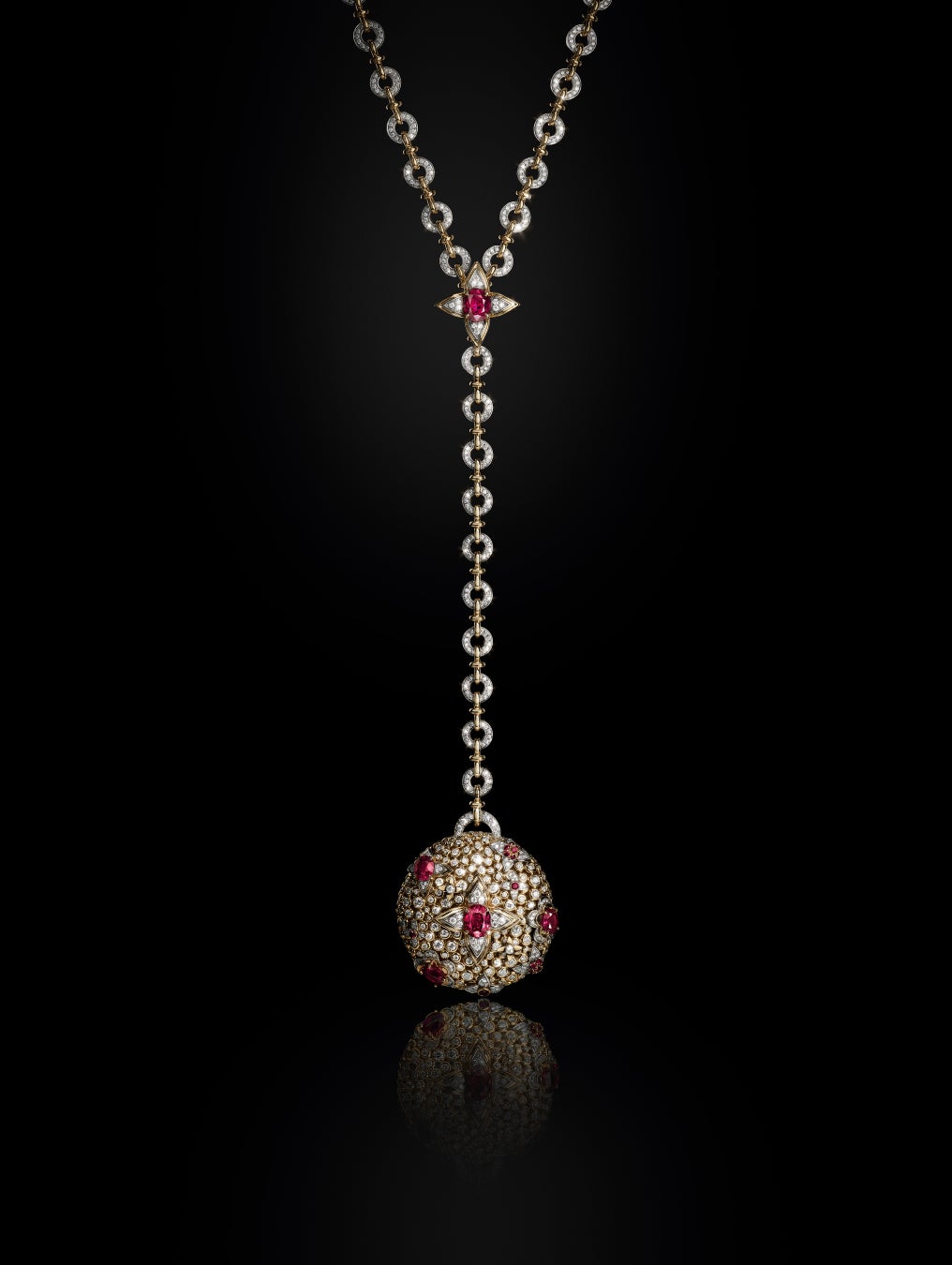 もう1つのルビーによって支えられたダイヤモンドとゴールドのチェーンが、洗練された上品な佇まいでペンダントに調和をもたらします。「Splendeur」の卓越した伝統への並外れた貢献を完結させる揃いのリングとイヤリングは、宝石職人の芸術性を反映すると共に、当時の驚くべき創造性を証明しています。