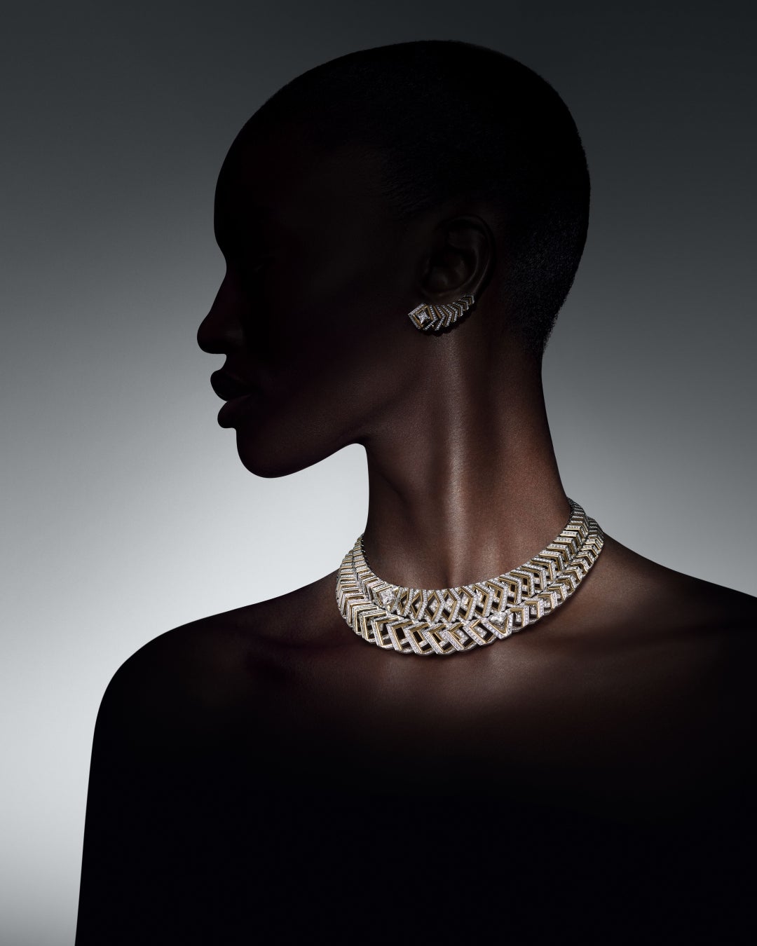 この新たなデザイン言語のダイナミックなクオリティが光を当てるのは、19世紀のモダンな集産主義への道。非常に構築的なネックレスは、リンクを美しく配列した細工により、一連の力強いグラフィックコードの中で動きをもたらします。旅という現象がルイ·ヴィトンを革新性の最前線に立たせたように、動きの相関性をグラフィカルに表現しながら、メゾンのハイジュエリー コレクションが掲げるビジョンと大志を前に推し進める「Dynamisme」。立体的な2連のオープンシェブロン·モチーフは、卓越した技術を際立たせます。自転車やエンジンと同様に、リンクは連携して作用し、視覚効果を発揮。プラチナとイエローゴールドを使用することで、三角形のコントラストがプレイフルに強調され、デザインの方向性を高めます。イエローゴールドに角度を付けてセットされたラウンドダイヤモンドがルイ·ヴィトンの「V」を連想させ、戦略的に配した2つの1.59カラットのLV モノグラムスターカットダイヤモンドへと視線を導くドミノ効果を生み出します。バゲット型のフレームにセットされた連動するスクエアシェイプダイヤモンドが、しなやかで幾何学的なデザインの中を縫うようにあしらわれ、「Dynamisme」のパワーの中心へと行き着きます。この時代への賛辞とルイ·ヴィトンの専門的な表現として、LV モノグラムスターカットダイヤモンドは、オープンシェブロン·モチーフのネックレス、ブレスレット、イヤリング、リングの中心で輝き、その美しさとパワーを示すと共に、ラグジュアリーを革新性の頂点に据える類い稀なサヴォアフェール(匠の技)を披露しています。