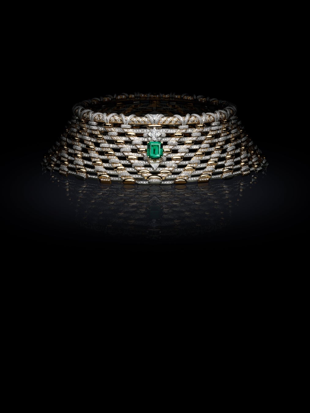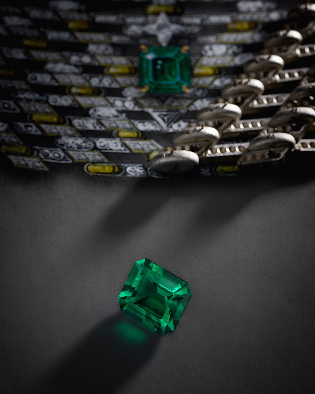フランスの磁器の技術から着想を得て、名高い格子細工や華麗な装飾、そして色彩豊かなレイヤーを取入れたこのジュエリーには、フランチェスカ·アムフィテアトロフによるディテールや革新性に対するこだわりと、その力強さが調和。技巧に富んだデザインの中でも代表的な「Phénoménal」のロープモチーフは、ルイ·ヴィトンのイコノグラフィーを盛り込んだネックレスにおいて、大胆で幾何学的な表現を用いるアムフィテアトロフの特徴的なスタイルを再提示します。曲線的なパターンは、バゲットダイヤモンドを配したパーツやダイヤモンドをふんだんにあしらったリングに、ゴールドを織物のように組み合わせ、メゾンのシグネチャーである「V」を想わせるデザインに。中心にはLV モノグラムスターカットダイヤモンドの下に優美な7.44カラットのコロンビア産エメラルドが輝きます。これは、メゾンの熟達した宝石鑑定士が調達したもので、「Phénoménal」のオープンウィーブ構造の複雑さを一層引き立てます。