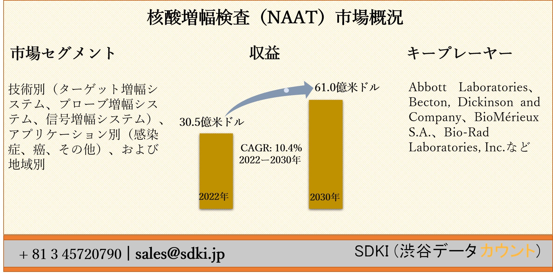 核酸増幅検査(NAAT)市場は、2022年に30.5億米ドルの市場価値から、2030年までに61.0億米ドルに達すると推定され、2022-2030年の予測期間中に10.4%のCAGRで成長すると予想されています。