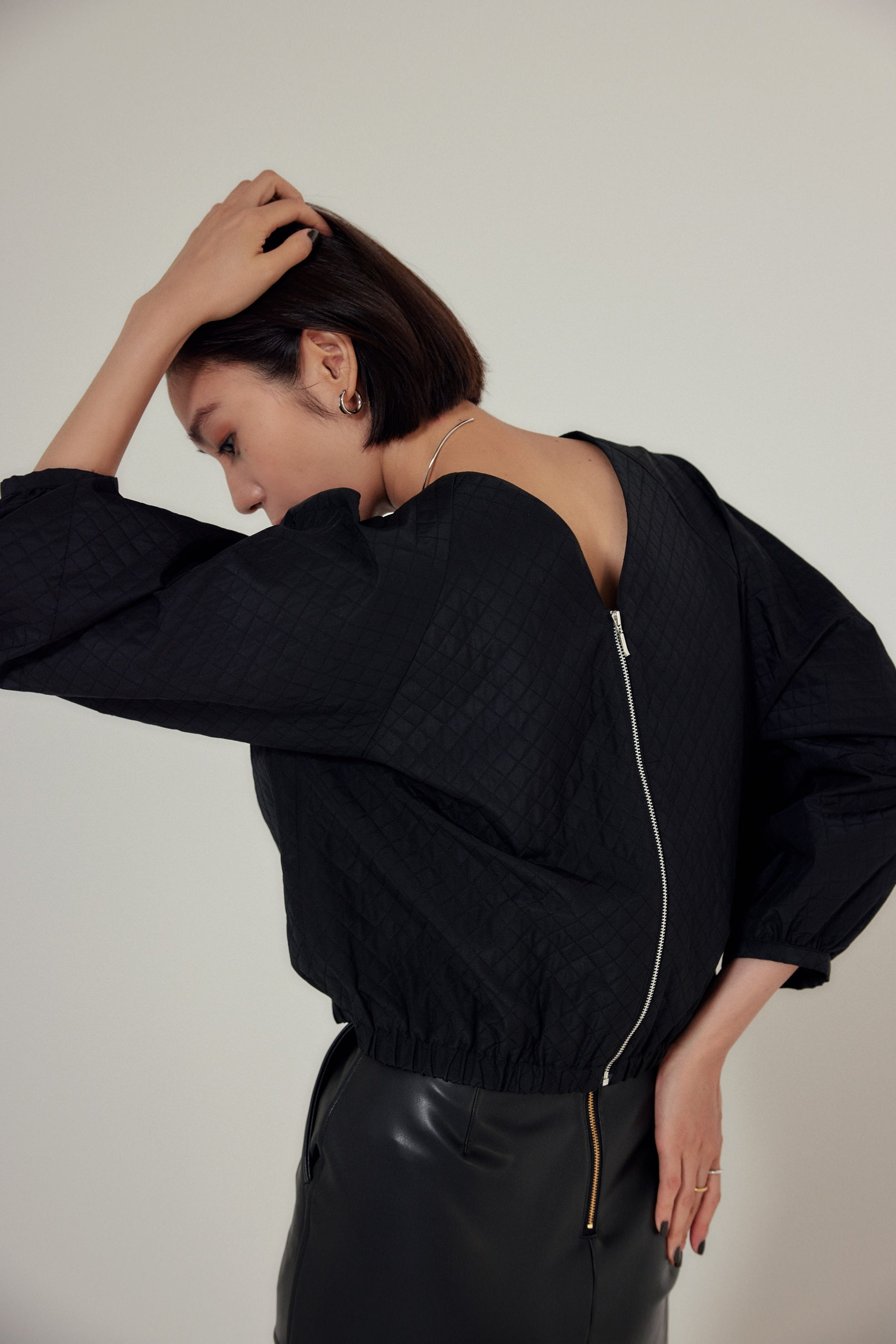 ダイヤ柄のキルティング風ジャカード。軽さとハリ感が特徴です。ブラウンはシャンブレーカラーで色の奥行が出ます。ランタンスリーブの短丈七分袖ブラウス。ZIPを後ろにしてPOとしても、フロントZIPでハオリブラウスとしても着用できる3wayデザインです。同素材のスカートと合わせてSET-UPでスタイリングするのもおすすめです。