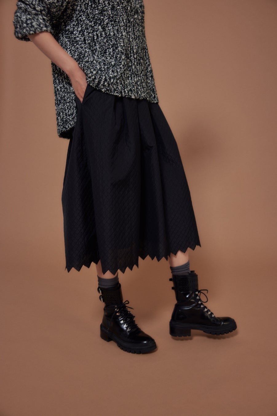 トップスと同素材でウエストサイドがゴムになったタックフレアスカート。裾はダイヤ柄に合わせてハンドカットした手の込んだデザインです。お揃いのトップスとスタイリングするのもおすすめです。