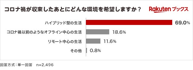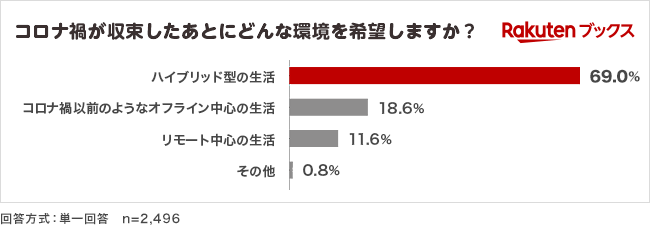 ●コロナ禍が収束したら希望する環境について尋ねたところ、学生はコロナ前のオフライン中心の生活に戻りたいという人が2割未満にとどまり、約7割がリモートとオフラインを併用するハイブリッド型の生活を希望していることが判明(図6)