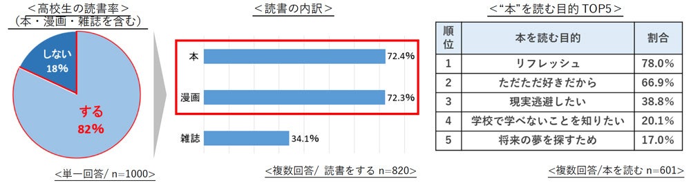 また、月間の平均読書時間は、「8時間」で、受験勉強に追われ自由時間が減る高校生にとって決して短くない時間であることが浮き彫りに。さらに、月に本や漫画、雑誌に使っている平均金額は「1,410円」となり、お小遣いの平均金額「5,582円」(※1)の約4分の1を占めていることが分かりました。宿題や課題のイメージから義務的と思われがちな、“本”に絞って読む目的を聞くと、1位「リフレッシュ」、2位「ただただ好きだから」、3位「現実逃避したい」がTOP3に入り、楽しみな息抜きとして読書に向き合っている様子です。