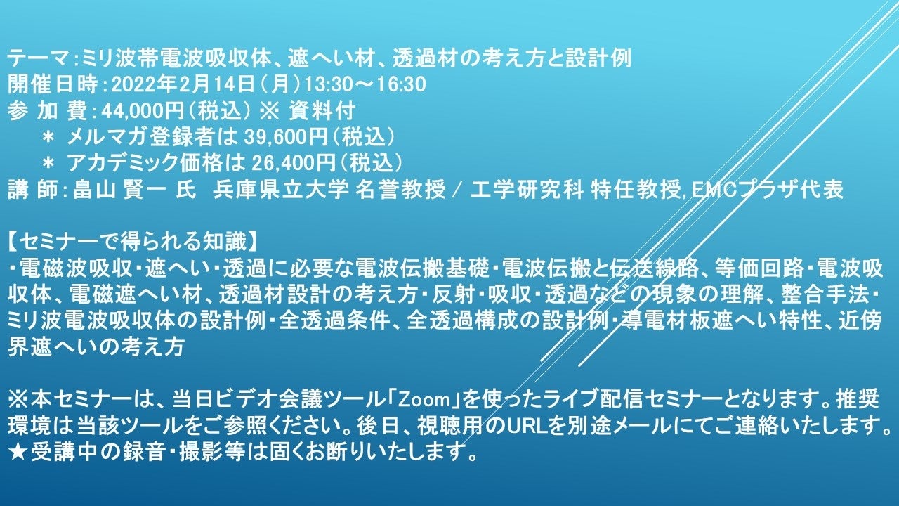 先端技術情報や市場情報を提供している(株)シーエムシー・リサーチ(千代田区神田錦町: https://cmcre.com/ )では、 各種材料・化学品などの市場動向・技術動向のセミナーや書籍発行を行っておりますが、 このたび「ミリ波帯電波吸収体、遮へい材、透過材の考え方と設計例」と題するセミナーを、 講師に畠山 賢一 氏 兵庫県立大学 名誉教授 / 工学研究科 特任教授, EMCプラザ代表)をお迎えし、2022年2月14日(月)13:30より、 ZOOMを利用したライブ配信で開催いたします。 受講料は、 一般:44,000円(税込)、 弊社メルマガ会員:39,600円(税込)、 アカデミック価格は26,400円(税込)となっております(資料付)。