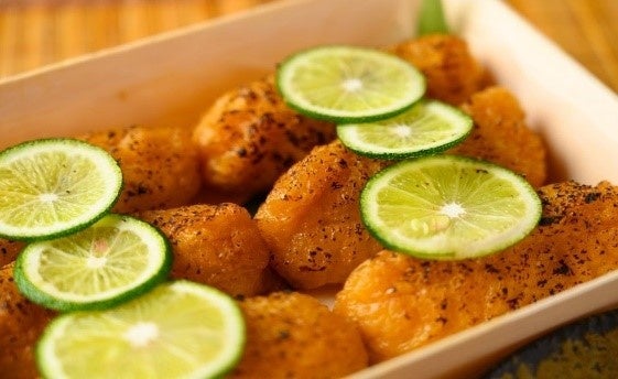 【さつま芋豚バラ巻き】レモンでさっぱりと煮たさつま芋を豚バラで巻き、さつま芋の皮で作った衣をでサクサク食感を追求しました。