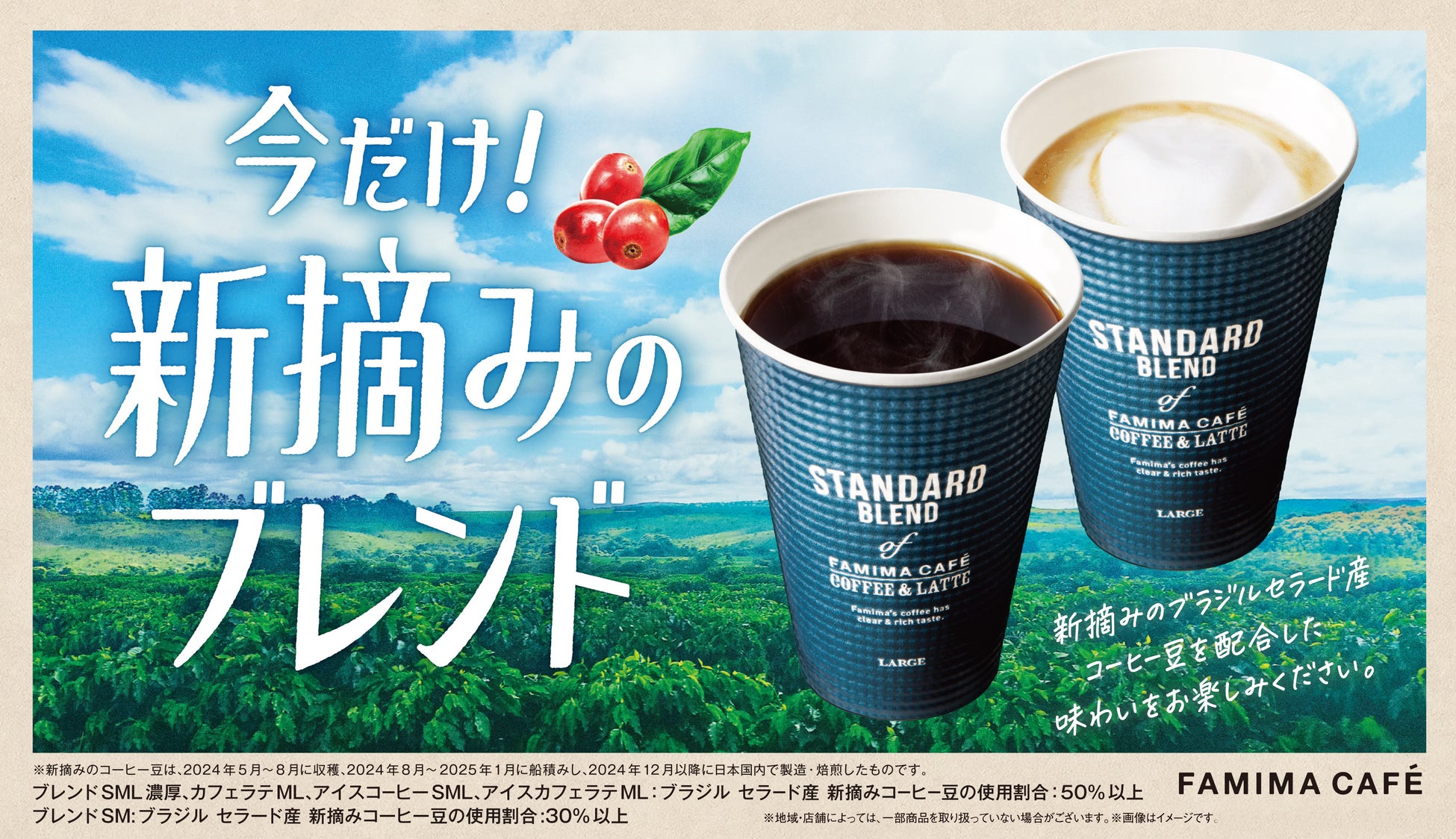 新米や新茶のようにコーヒー豆にも旬があり、FAMIMA CAFÉの「新摘みブレンド」は、2024年5月〜8月のピーク時期に収穫、2024年8月〜2025年1月に船積みし、その後日本国内で製造・焙煎されたブラジル セラード産の最高等級豆を、ブレンドに30%以上、ブレンド濃厚・アイスコーヒー・カフェラテ・アイスカフェラテに50%以上使用しています。