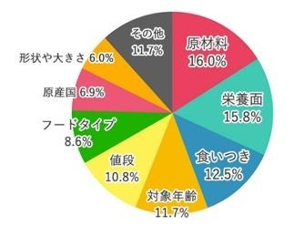 原材料や栄養面を重要視が30%を超える結果に。やはり、フードの安全性にこだわる人が多いことがわかった。続いて、くいつきと回答した人が12.5%となっており、ペットとの相性や反応を見てから決めている人が多いよう。