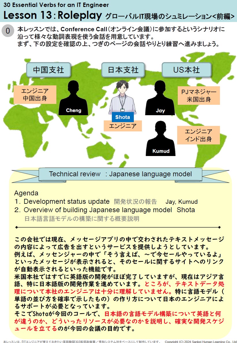 本講座は全34レッスンです。うち2つのロールプレイレッスンでは、オンライン会議のシミュレーションを通じ、グローバル開発現場での会話スキルを強化します。会議は、米国や中国のエンジニアが参加する設定で、接続の開始から議論まで実際に行われる会議の雰囲気の中で、実践的に使える表現を練習できます。