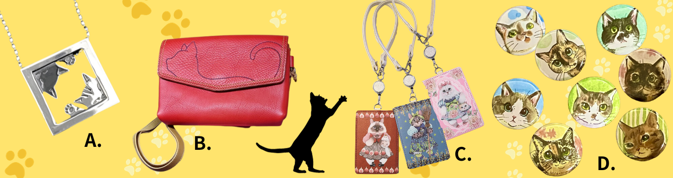 A)猫の形や表情が一匹一匹異なるシルバーのアクセサリー。