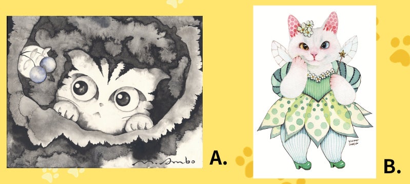 B)カラフルな絵柄のお洋服を着たむっちりと福福しい「猫の肖像画」。