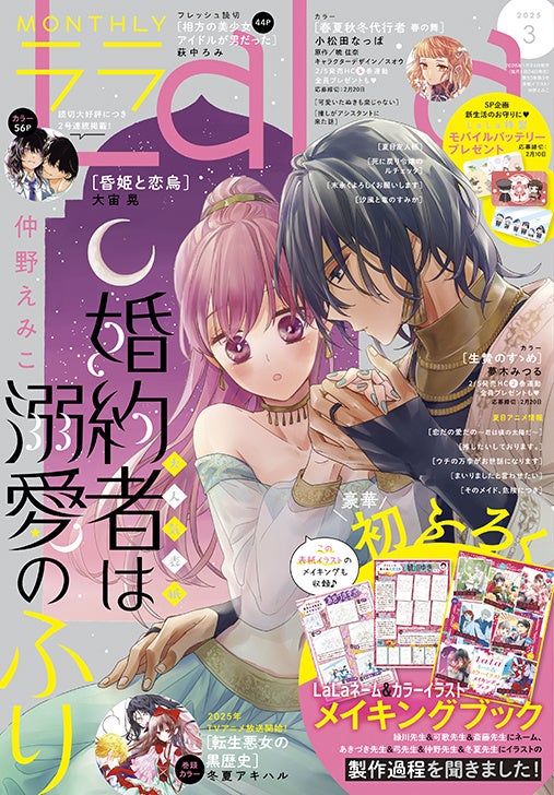 株式会社白泉社(本社:東京都千代田区、代表取締役社長:高木靖文)は、『LaLa』2025年3月号を1月24日(金)に発売しました。今号は豪華作家陣にネーム&イラストの製作過程を聞いたスペシャルブックのふろくつき!表紙には、「婚約者は溺愛のふり」(仲野えみこ)が登場。巻頭カラーは、TVアニメが2025年放送予定の大ヒット作「転生悪女の黒歴史」(冬夏アキハル)。HC最新第5巻が2月5日(水)に発売する「春夏秋冬代行者 春の舞」(小松田なっぱ 原作:暁 佳奈 キャラクターデザイン:スオウ[電撃文庫/KADOKAWA刊])と「生贄のすゝめ」(夢木みつる)、読切大好評につき前後編にて再登場の「昏姫と恋烏」(大宙晃)はカラーつきで登場です!そのほか最新情報も盛りだくさん!