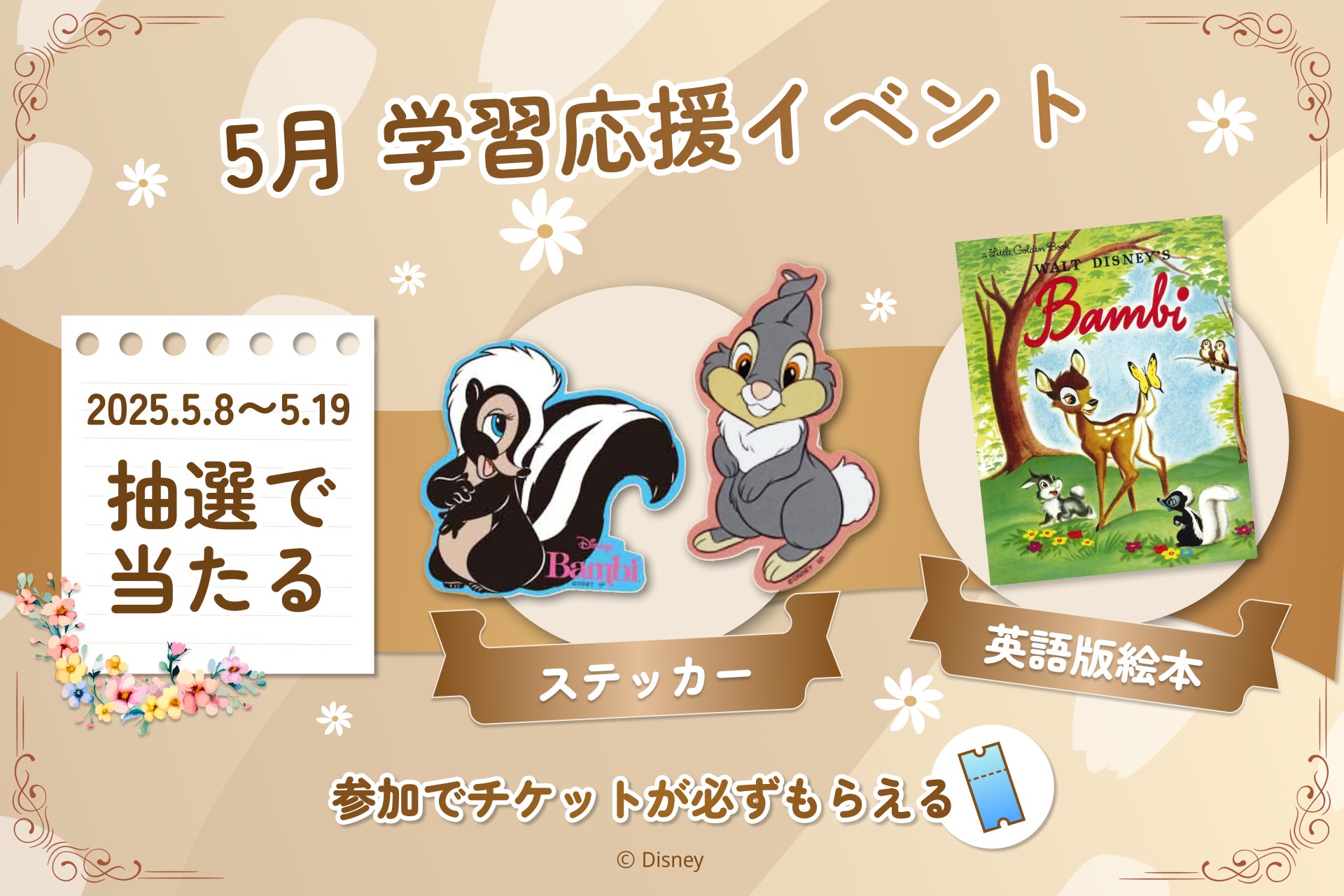 5月8日(木)より開催中の初級者向け学習応援イベントでは、学習回数に応じて応募できるプレゼント企画を実施中。『バンビ』の「英語版絵本」や、映画『バンビ』のキャラクターデザインのステッカーが抽選で当たります。
