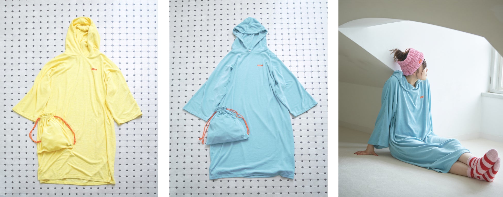 ボリューム感のあるポンチョデザインがポイントです。胸元にはワンポイントのプリントを施しています。ワンピースと同素材の巾着もセットになっていて、ワンピースを収納できるようになっています。