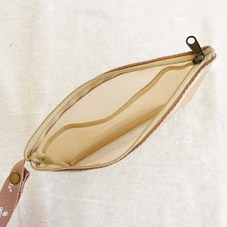 A5サイズで間仕切りつき、内ポケット2つを装備。濡れても水分を拭き取れる素材を採用。ループがついているため手持ちしやすく、バッグに取りつけて貴重品入れとして使っても便利です。