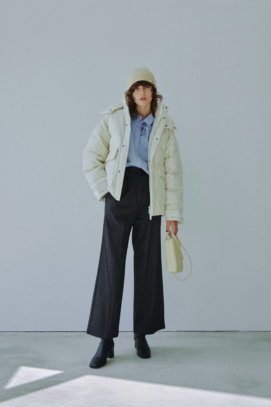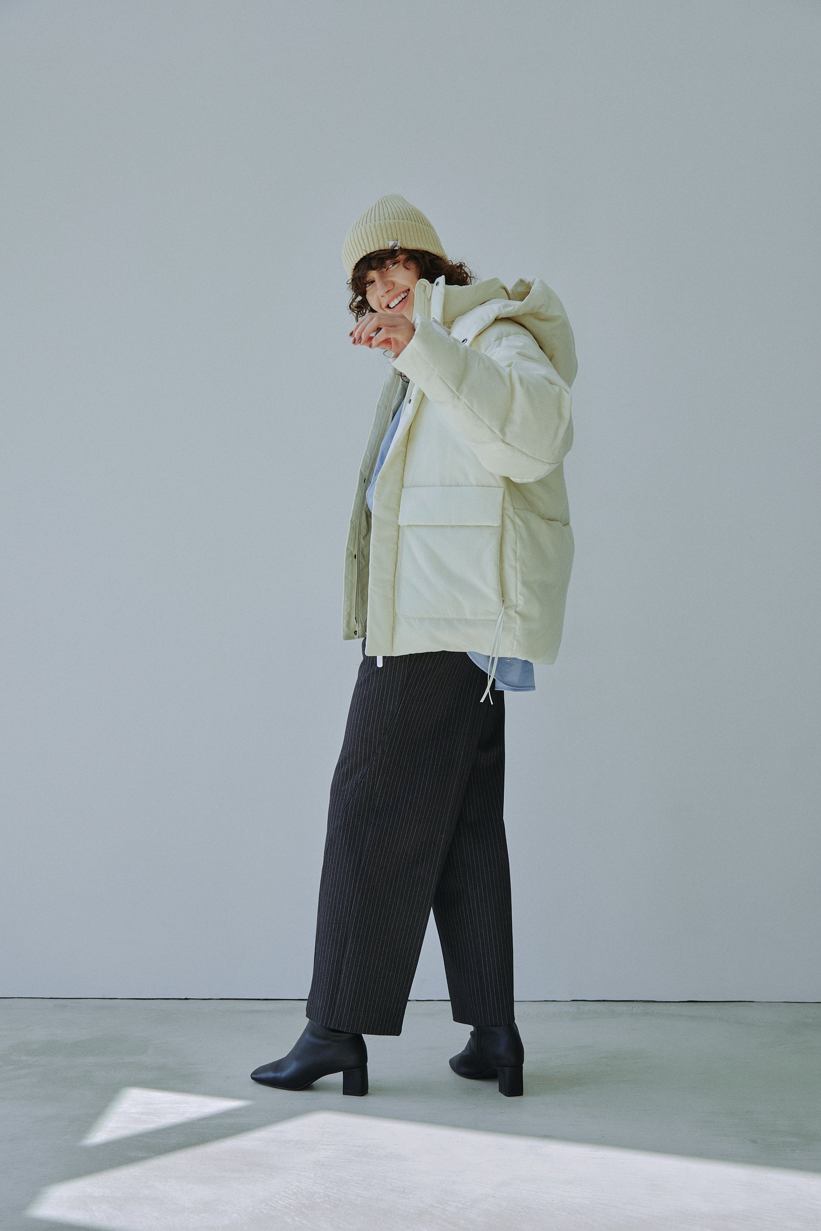 オーバーシルエットなので、厚手のニットやボリュームスリーブのアウターとしても活躍します。ニュアンスカラーがスポーティーすぎず、モードな装いに格上げしてくれます。