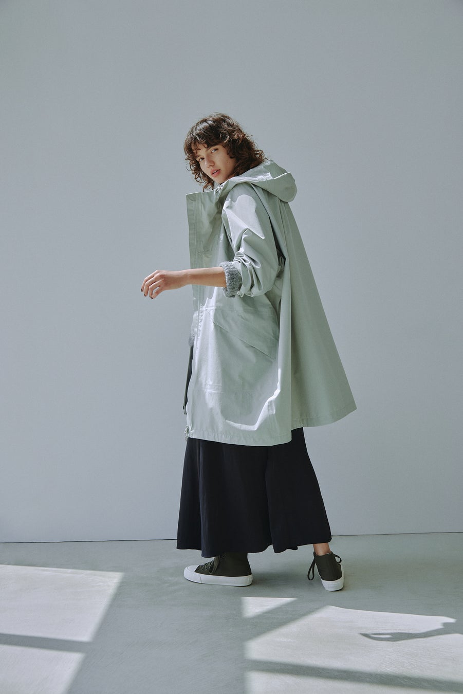 レインコートはアウトドアや雨の日に使用できる実用的なアイテムを、emmi別注のミントグレーでカラーリング。