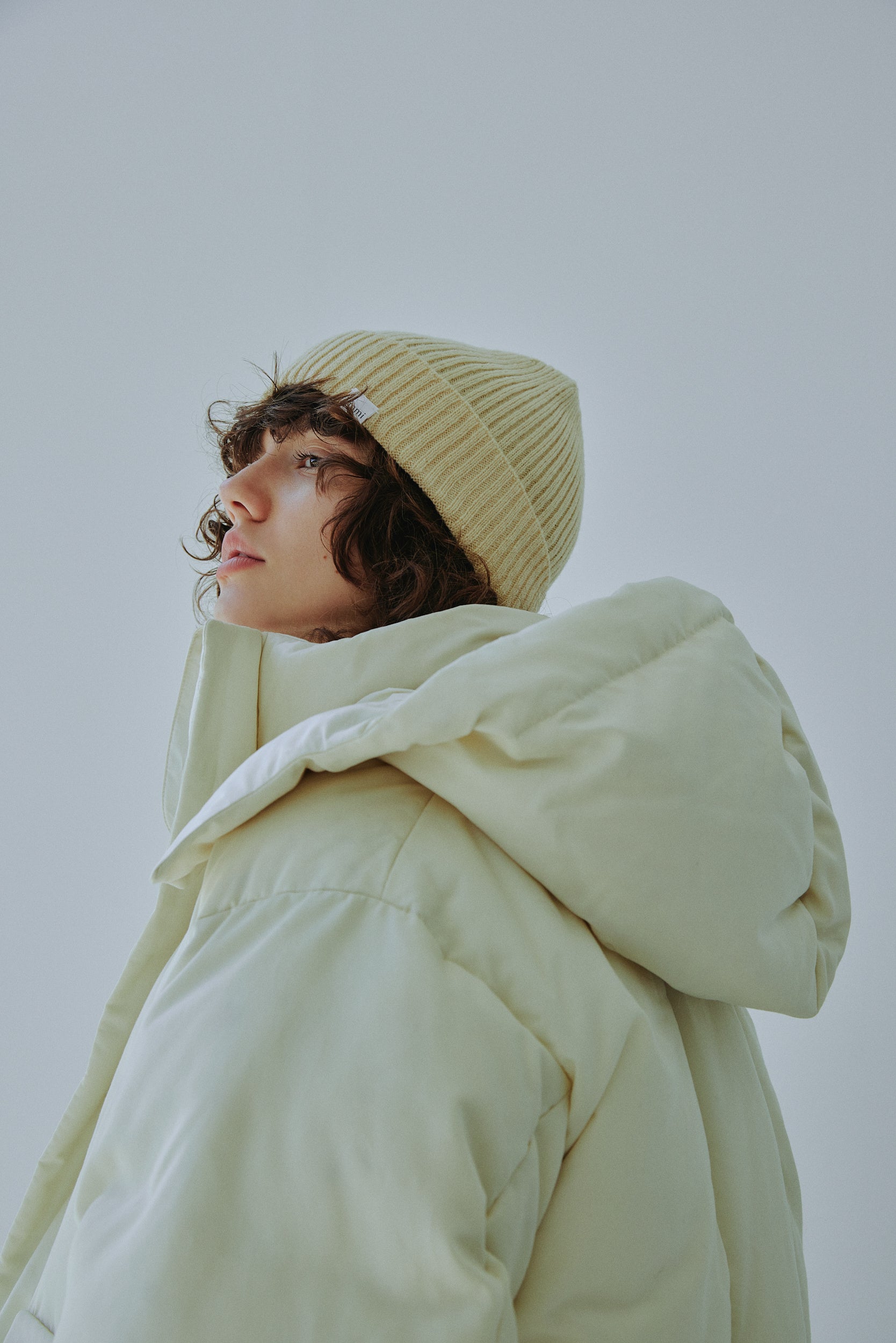 ダウンジャケットはemmiオリジナルデザインで別注。腕周りをゆったりとしたサイズ感にし、ボリューム袖のニット合わせなど、ファッショナブルにスタイリングできるデザインにアップデート。フードも取り外し可能なので、スタイリングやオケージョンによってアウトドアにもタウンユースにもマッチ。表地は再生セルロース繊維、中綿にはリサイクルダウンを封入したサステナブルなリサイクルダウンです。袖には刺繍でHELLY HANSEN とemmiのWネームを施しています。