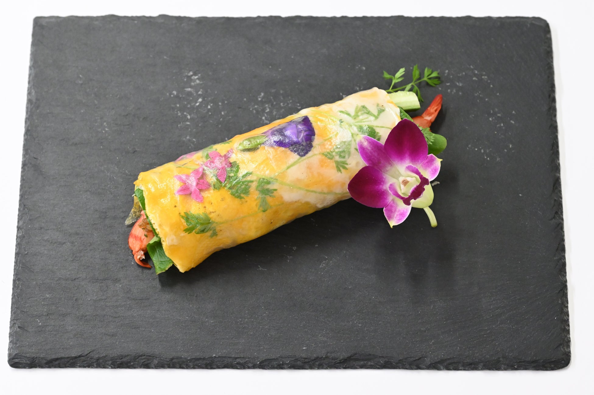 ベトナム料理に欠かせない調味料ヌクマムで味付けしたチャーハンを、レタスと玉子焼き、ライスペーパで包みました。鮮やかなエディブルフラワーがアクセントです。