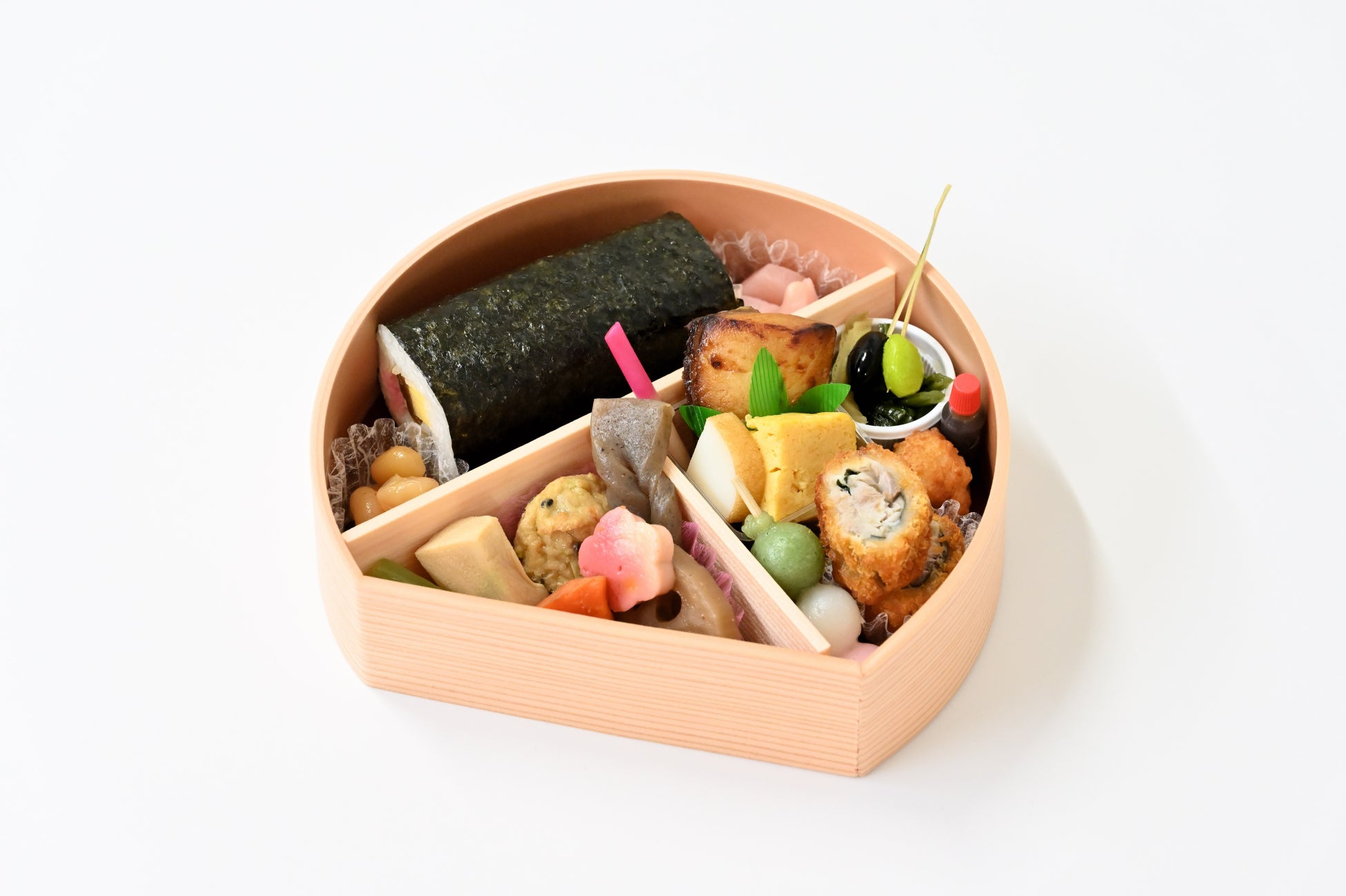 恵方巻だけでなく、おかずでも節分を楽しみたいというお声に応えた恵方巻弁当。ご飯の部分に恵方巻が入り、鬼や邪気を追い払う「イワシ」や「大豆」を使ったイワシフライや豆昆布などを一緒にお楽しみいただけます。