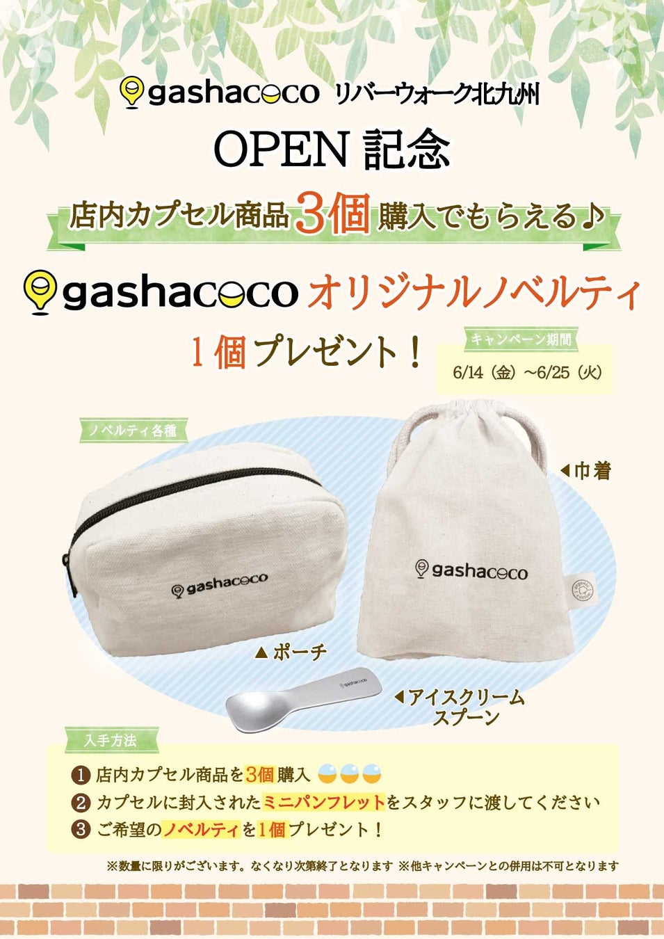 6月14日(金)~6月25日(火)まで、OPEN記念として店内のカプセル商品を3個購入していただいた方に「gashacocoロゴ入り オリジナルノベルティ」を1個プレゼント!