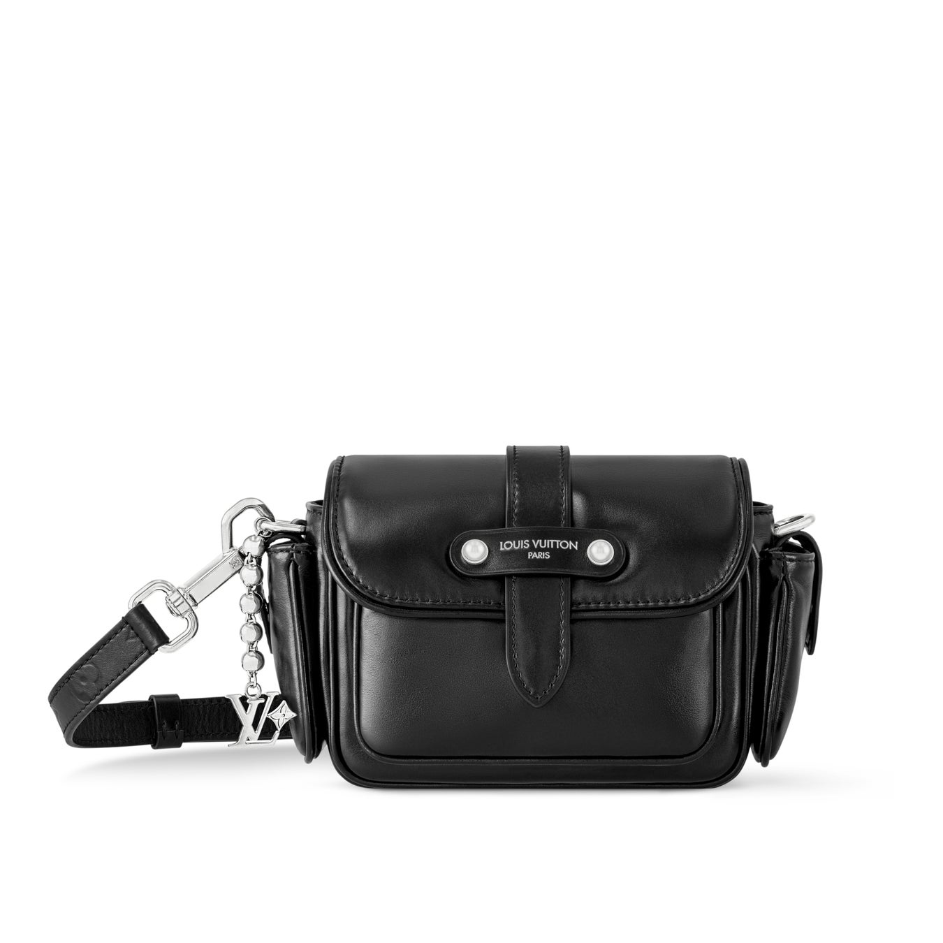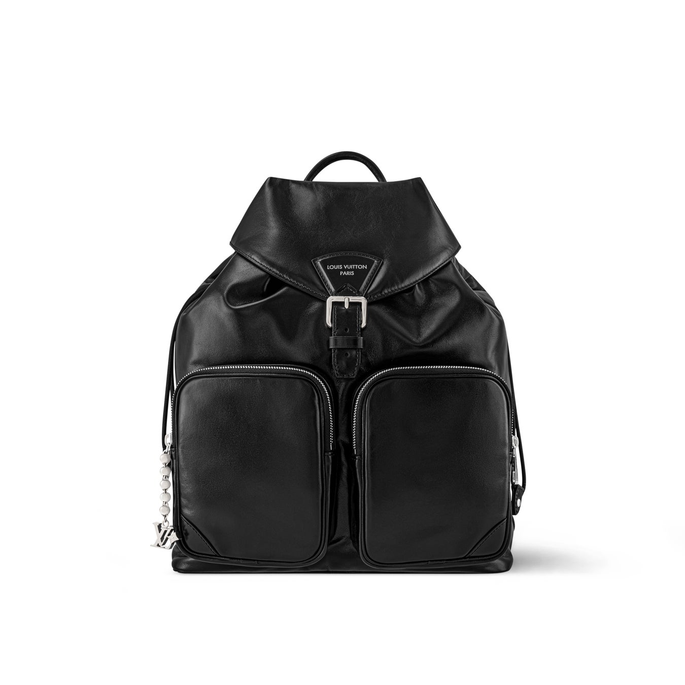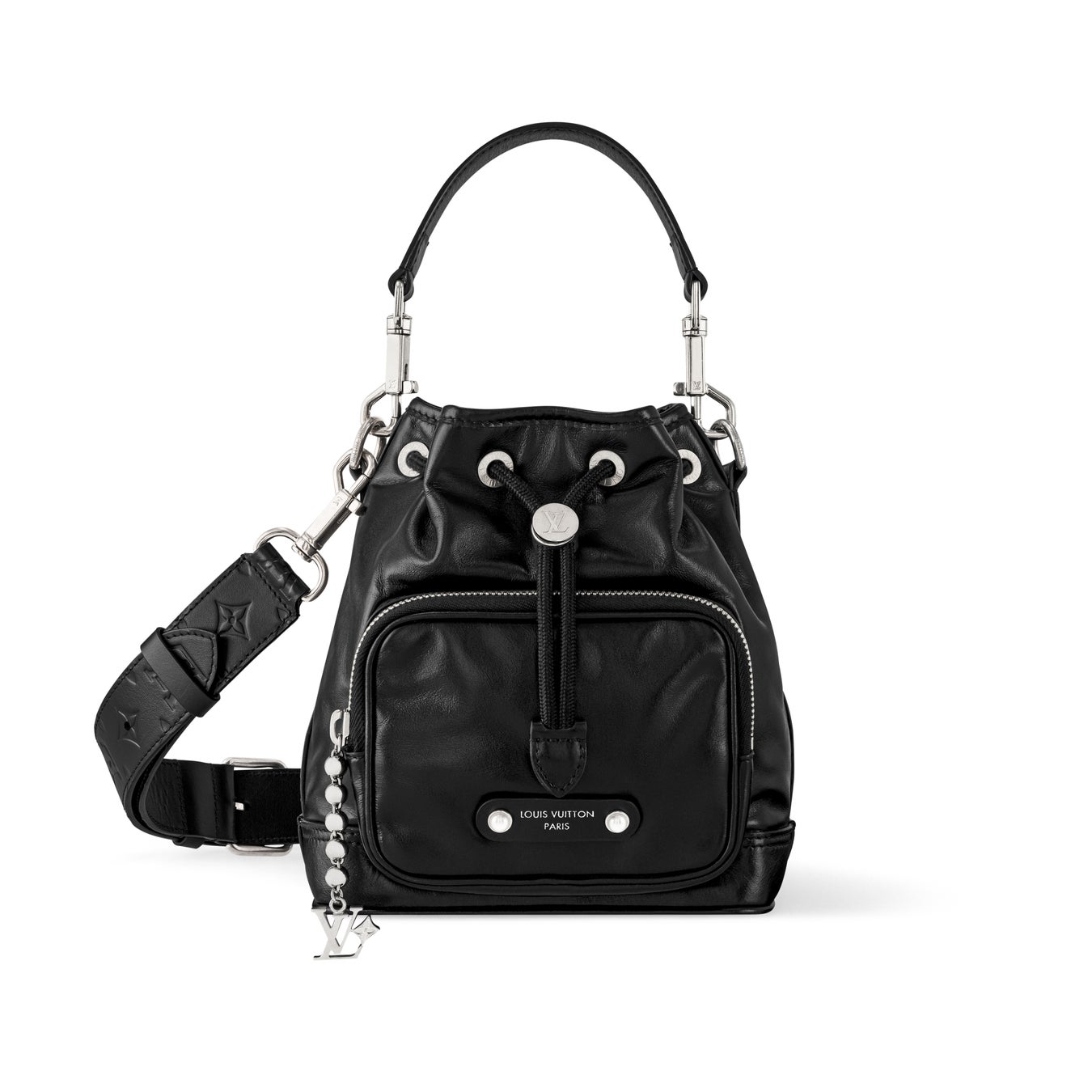 ボールチェーンに取付けられたLV イニシャルをはじめとするシルバーカラーの金具がモノトーンの外観にアクセントをプラス。広々とした容量のフロントポケットを備えたバッグです。