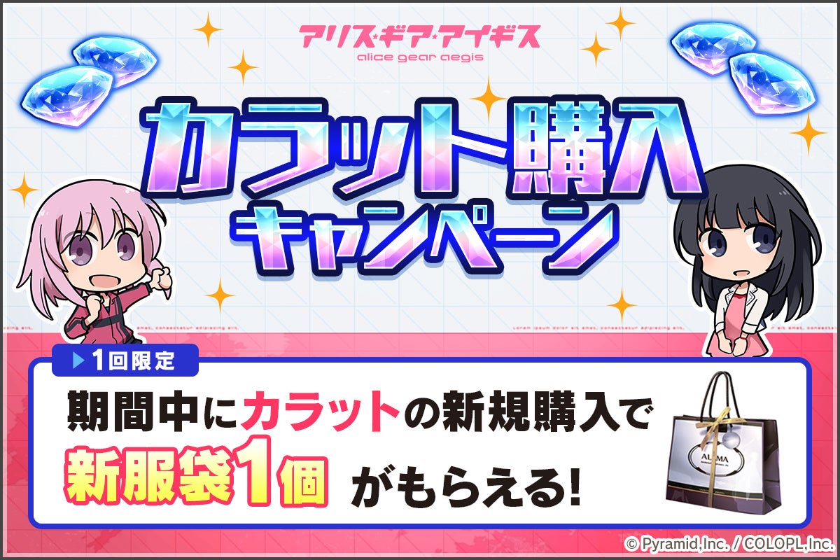 期間中に「カラット」を新規にご購入いただいたお客様に、1回限定で「新服袋」1個を受取箱にプレゼントいたします。