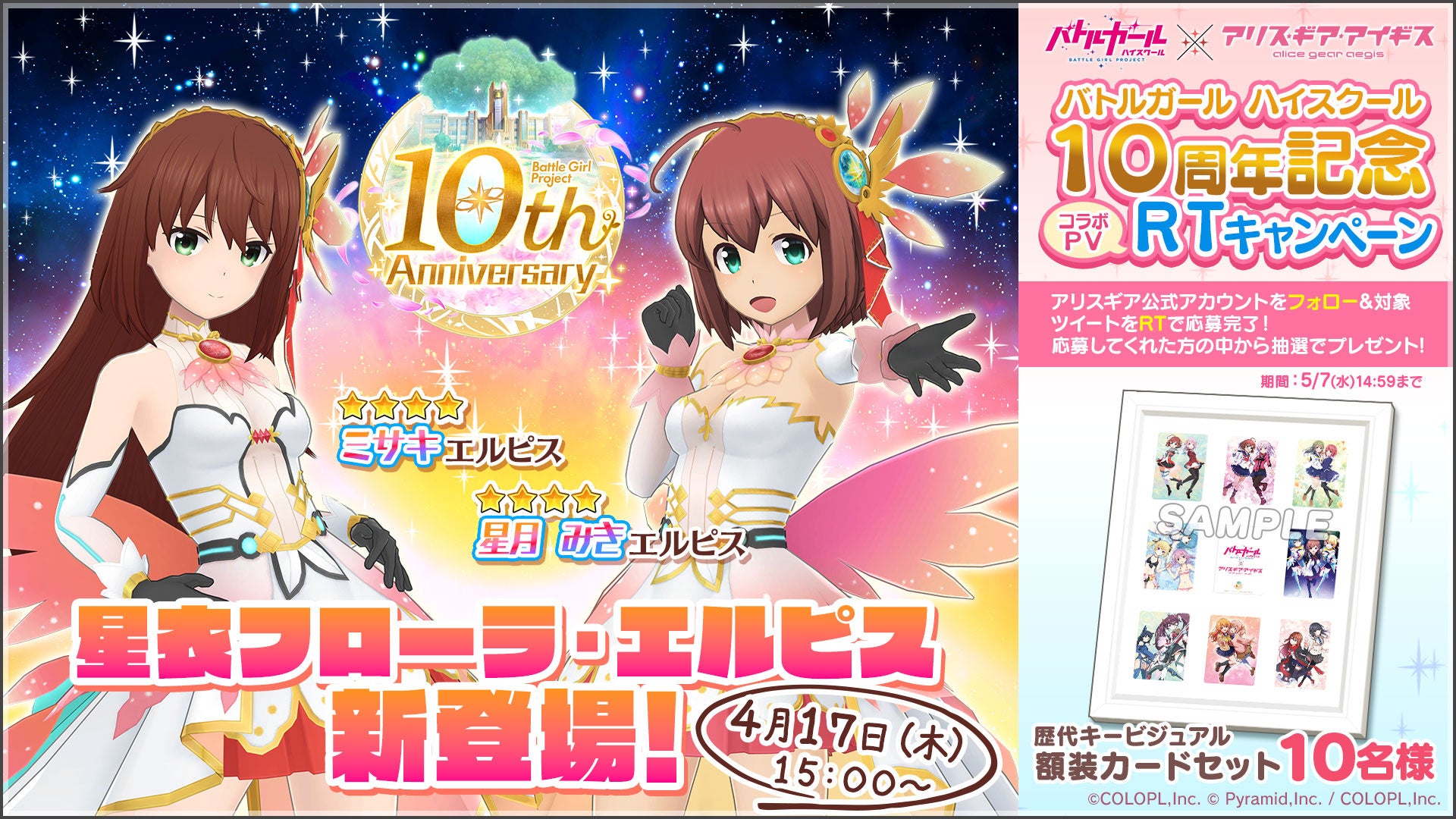 『バトルガール ハイスクール』の10周年を記念して、『アリス・ギア・アイギス』にて様々なゲーム内キャンペーンやアップデートを実施しております。各種詳細はゲーム内お知らせをご確認ください。