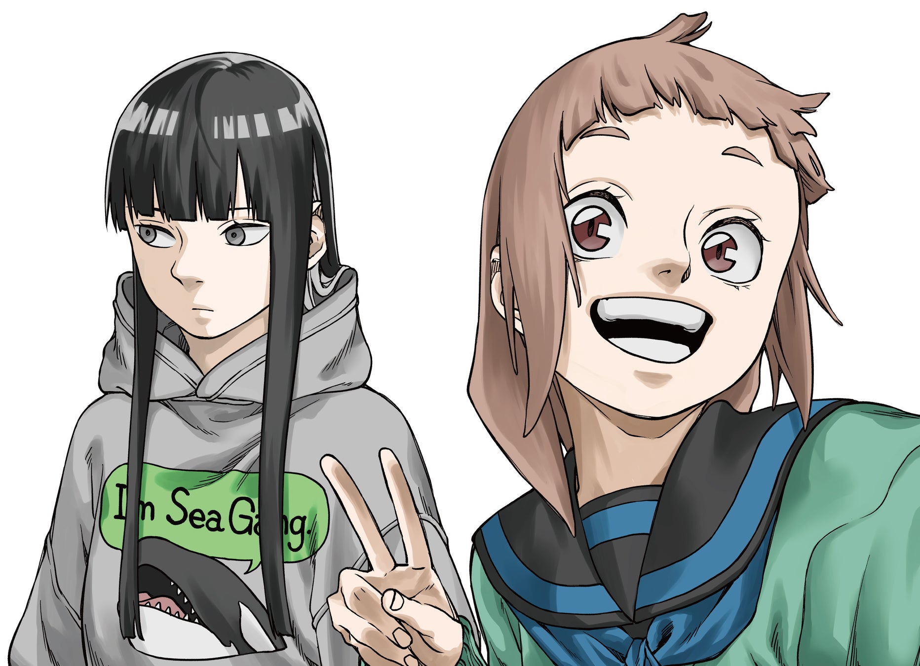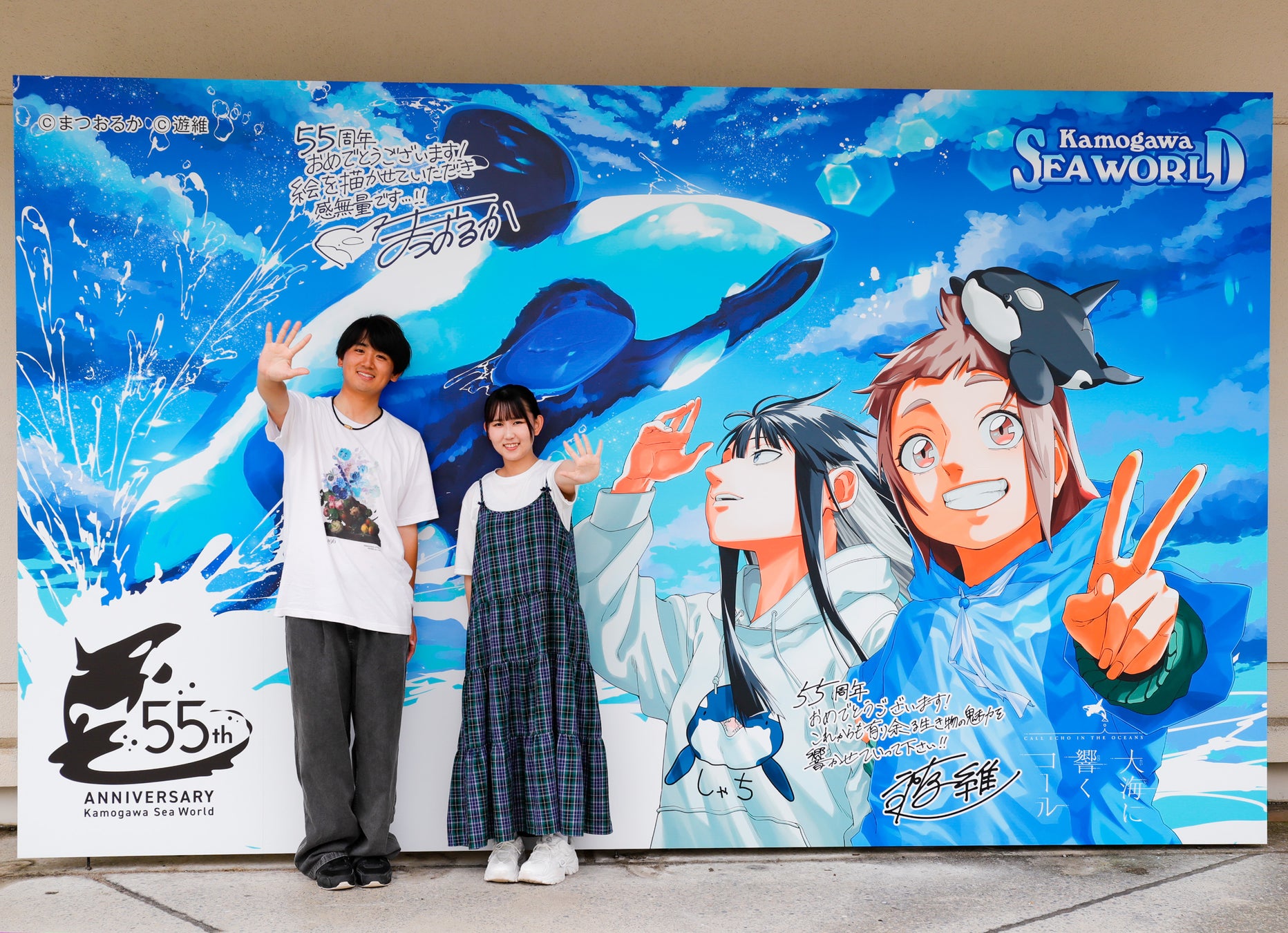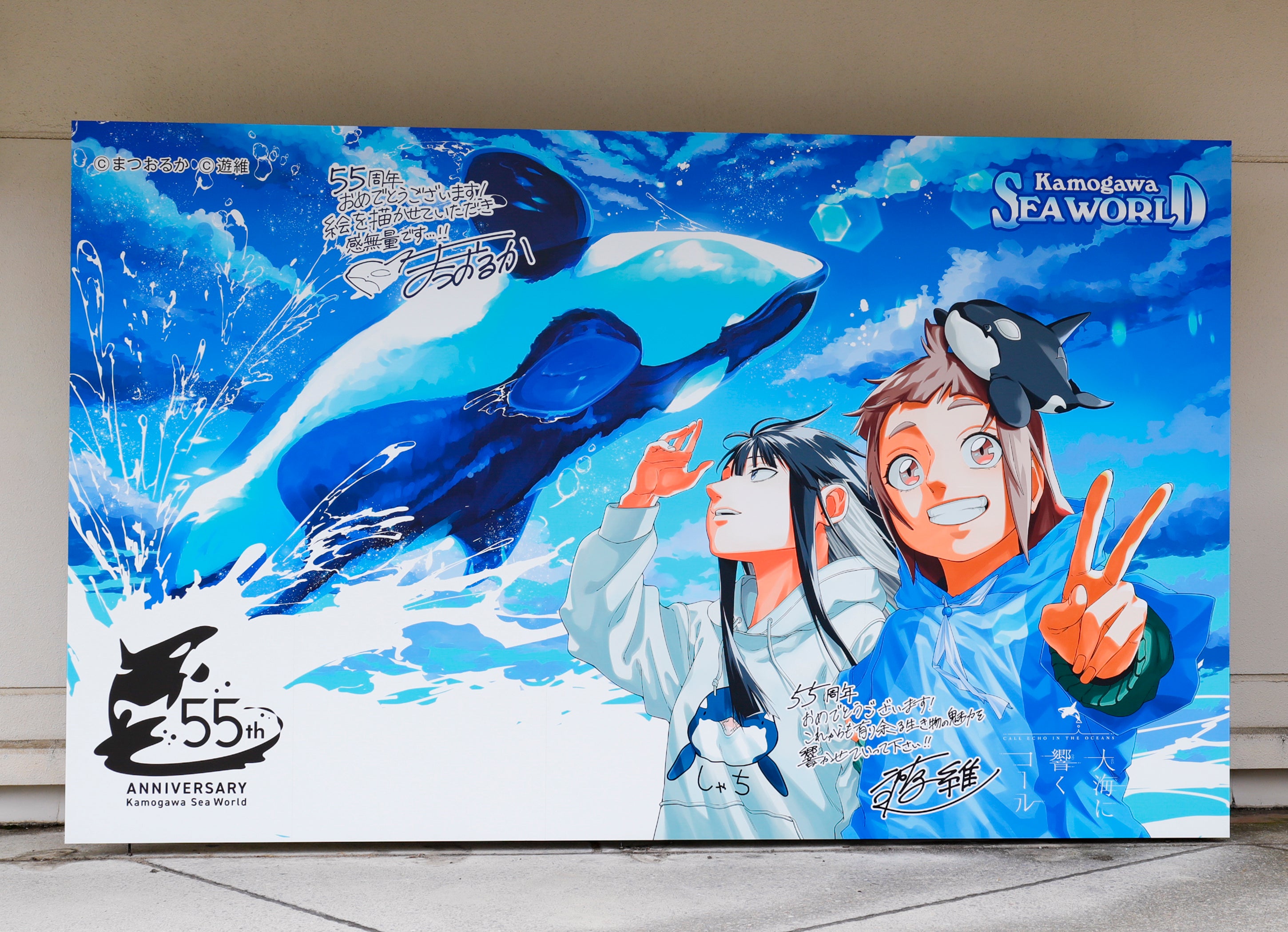 鴨川シーワールドにゆかりのある2名の漫画家による合作イラストで制作され、横幅4メートルにも及ぶ大迫力の作品に仕上がっています。シャチのイラストを担当したのは、海の動物たちや水族館の話題をイラストを通して紹介し、シャチ愛のあまり自身をもイラストでシャチ化した人気の漫画家まつおるか先生です。もう一名は、小学館の月刊誌「ゲッサン」でシャチに魅せられた高校生たちの青春を描く「大海に響くコール」を連載中の遊維先生で、作中に登場する主人公「ぴょこ」と「神崎さん」を書き下ろしていただきました。