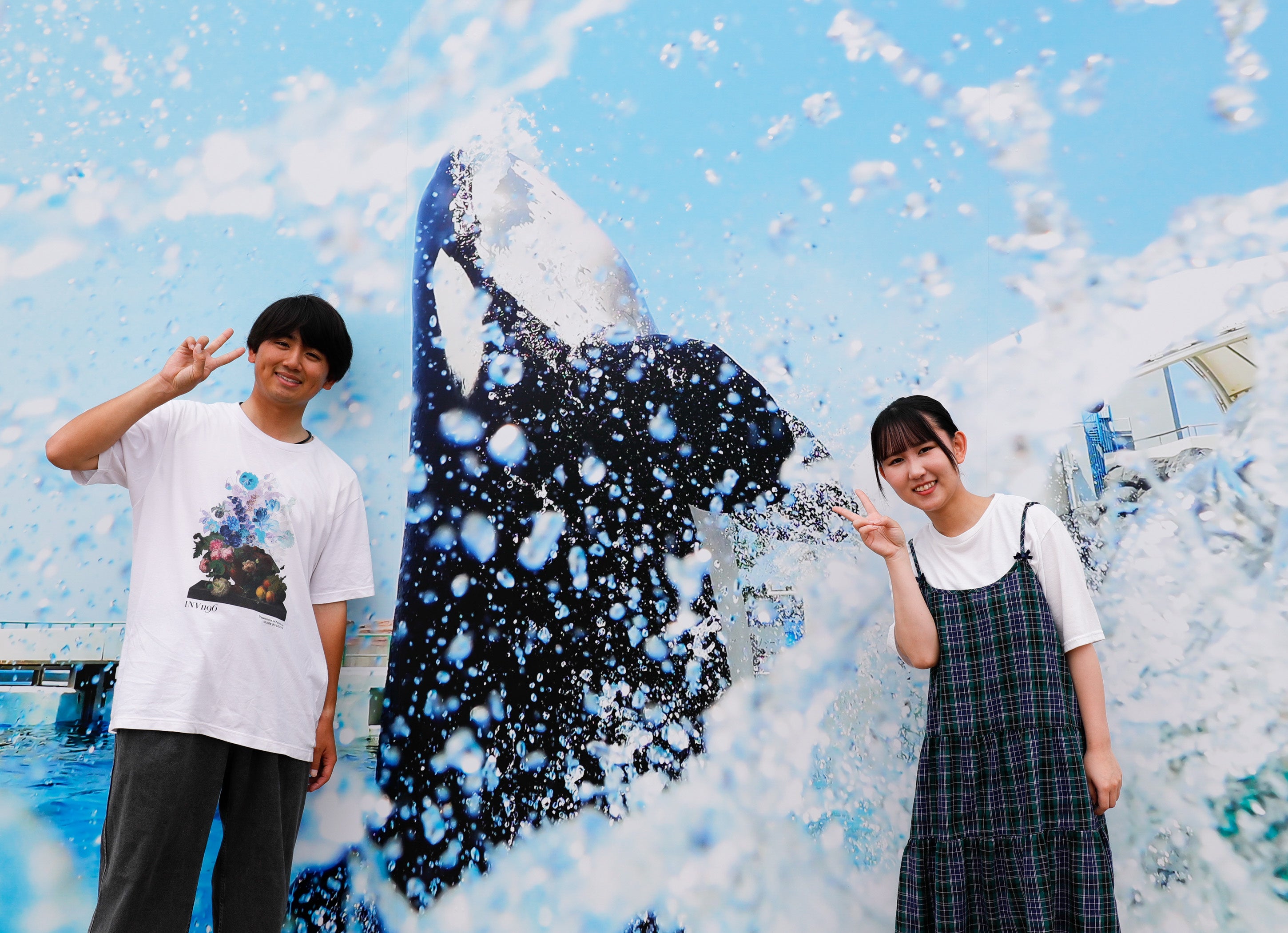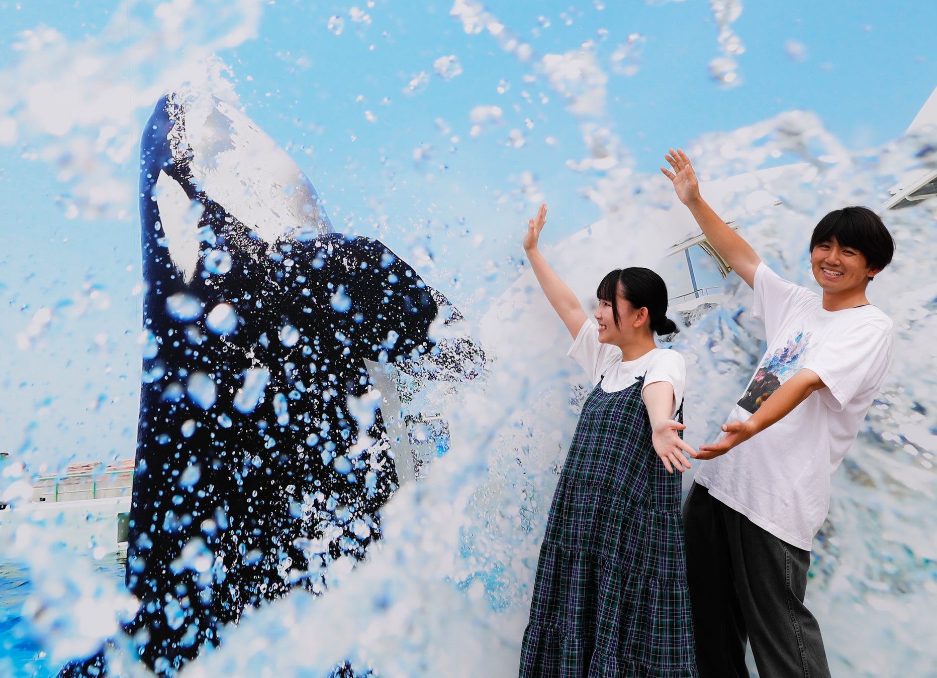 雄大な太平洋が広がる海側通路のフォトエリアに新設されたのは、2022年~2024年のオリジナルカレンダーを担当した水中写真家の戸村裕行さんが撮影した大迫力なシャチの写真を使用したフォトスポットです。「サマースプラッシュ」で濡れた衣類を記念写真に活かせるように制作され、思い出に残る一枚を撮影できます。